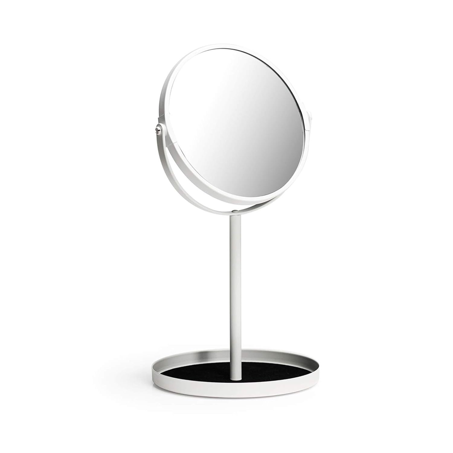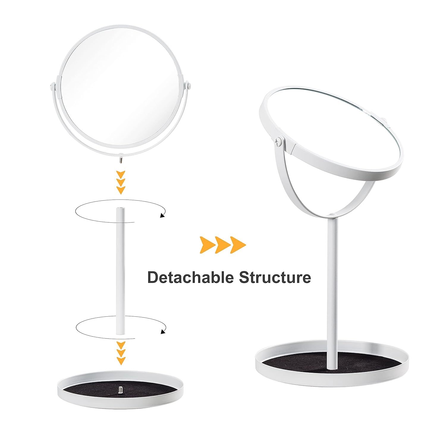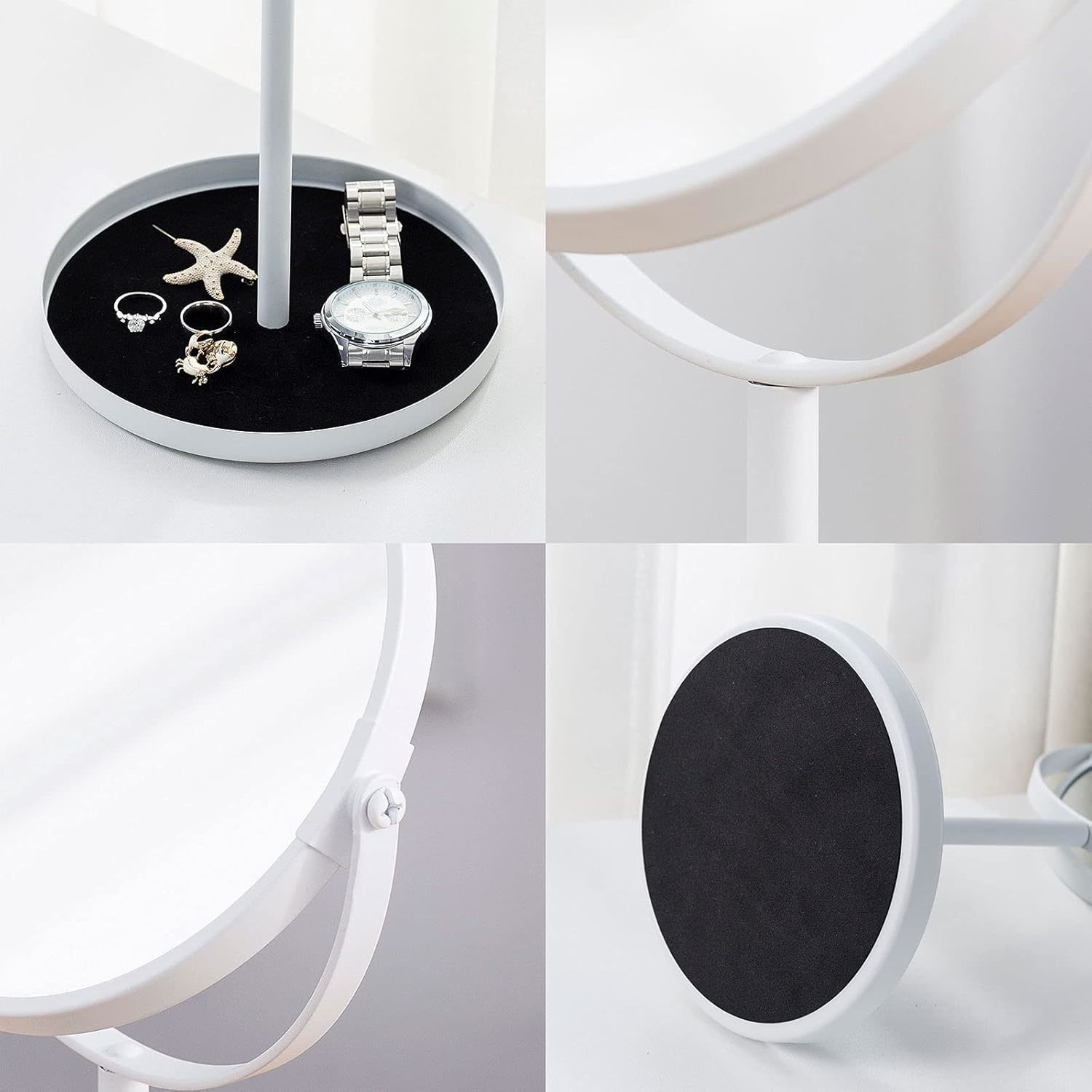 Smooth 360-degree swivel design to help you achieve the right position. Double-Sided vanity mirror: 1X and 5X Magnification is used for daily make-up,routined skincare and more. Makeup Mirror Bottom tray for small items organization such as rings, cosmetics, grooming tools and more. Ideal for makeup vanity, bedroom, living room, bathroom, office and jewelry stores.