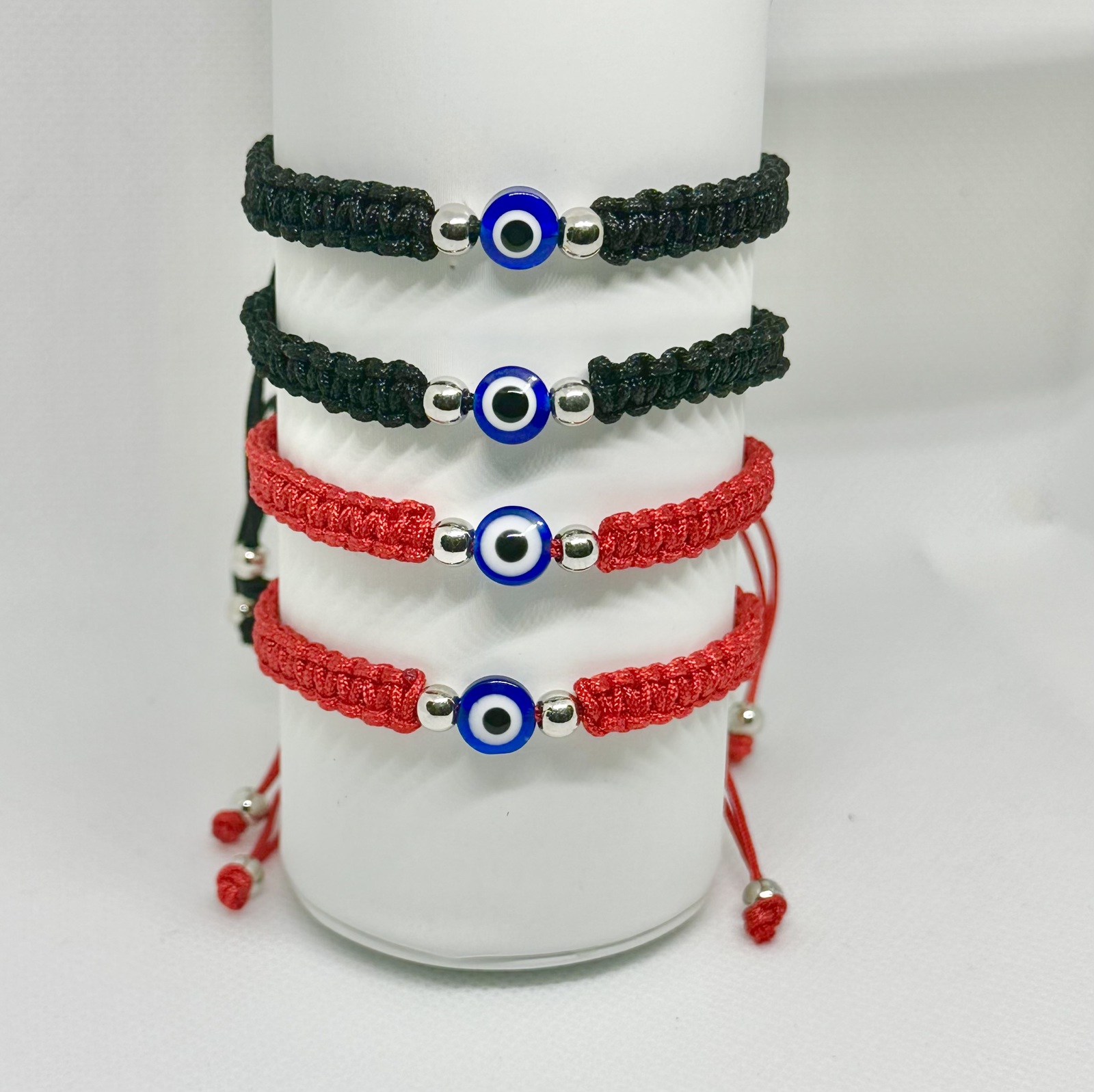 Discover the mystical allure of The Lucky Charm Evil Eye bracelets, a set of four protective amulets designed to ward off negative energy. Each bracelet features a striking deep blue glass bead with the distinctive evil eye symbol, beautifully accented by gold-toned beads. Available in both classic black and vibrant red cord options, these adjustable bracelets are perfect for sharing with family or wearing as a matching set. The evil eye symbol has been treasured across cultures as a traditional talisman for protection and good fortune. These versatile pieces can be worn alone for a subtle look or stacked for a more dramatic effect. The durable cord and secure construction ensure these meaningful accessories can be worn daily. Whether you're seeking a meaningful gift or a personal lucky charm, these bracelets offer both style and symbolic significance. Each set includes four individual bracelets, making them perfect for sharing with loved ones or keeping as backups.