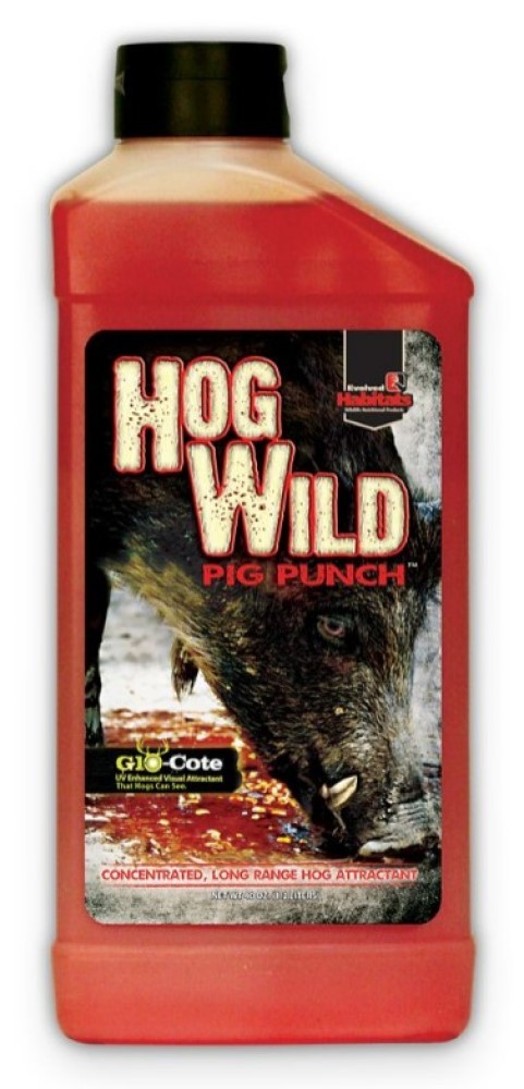 Glo-Cote'UV enhancement allows hogs to "see" the pig punch mix This Evolved Habitats pig punch generates hog wallows Habit-forming to keep hogs coming back Irresistible fruit punch taste draws hogs in Long-range hog fruit-flavored pig punch attractant allows you to reach a wide area of hogs Distributes potent scents immediately upon application Hog Wild pig punch size: 40oz. Includes directions on enhancing existing wallows, creating new wallows, baiting large traps, and baiting small metal traps