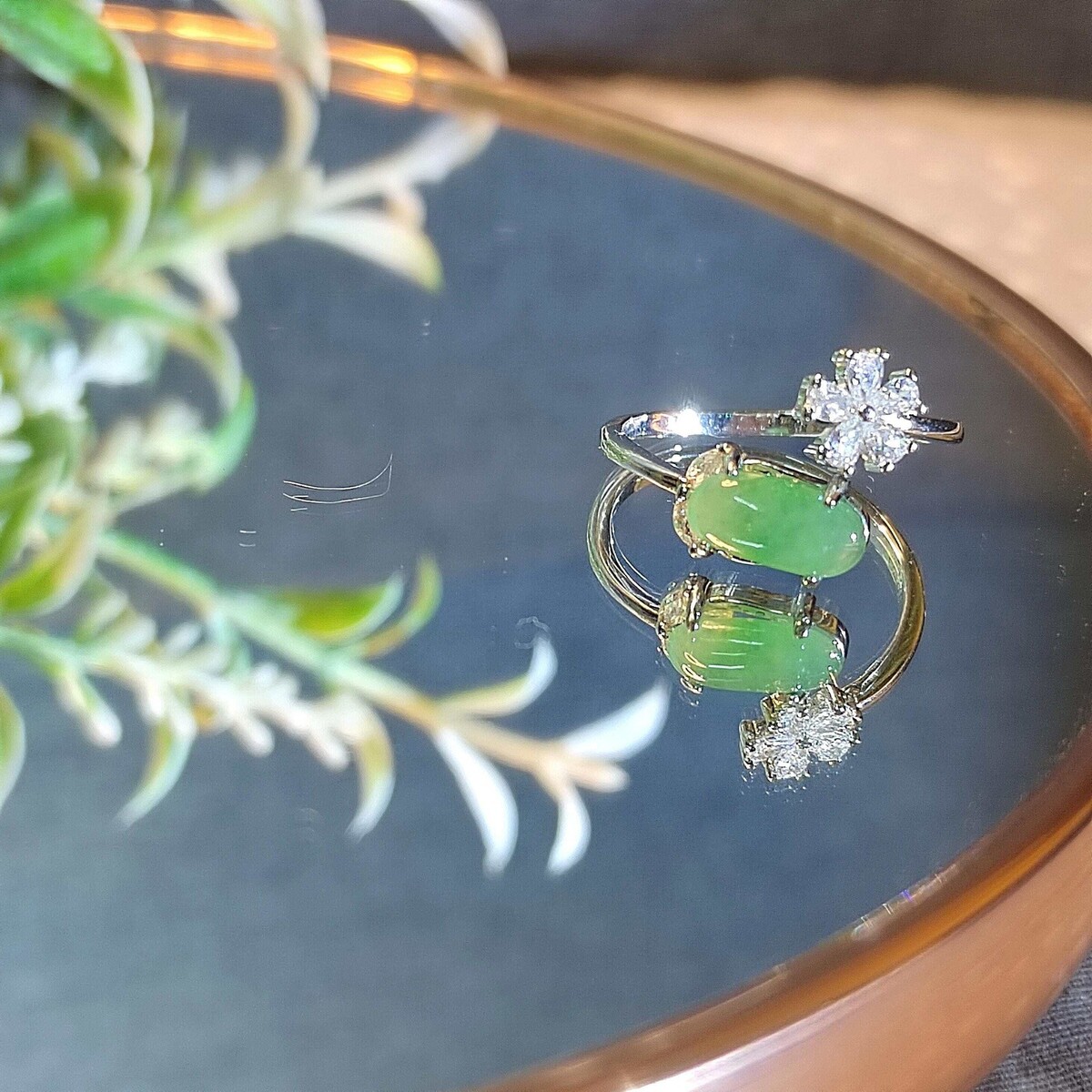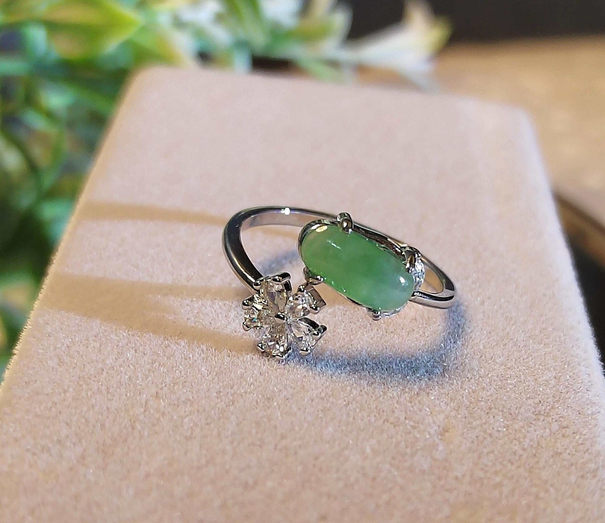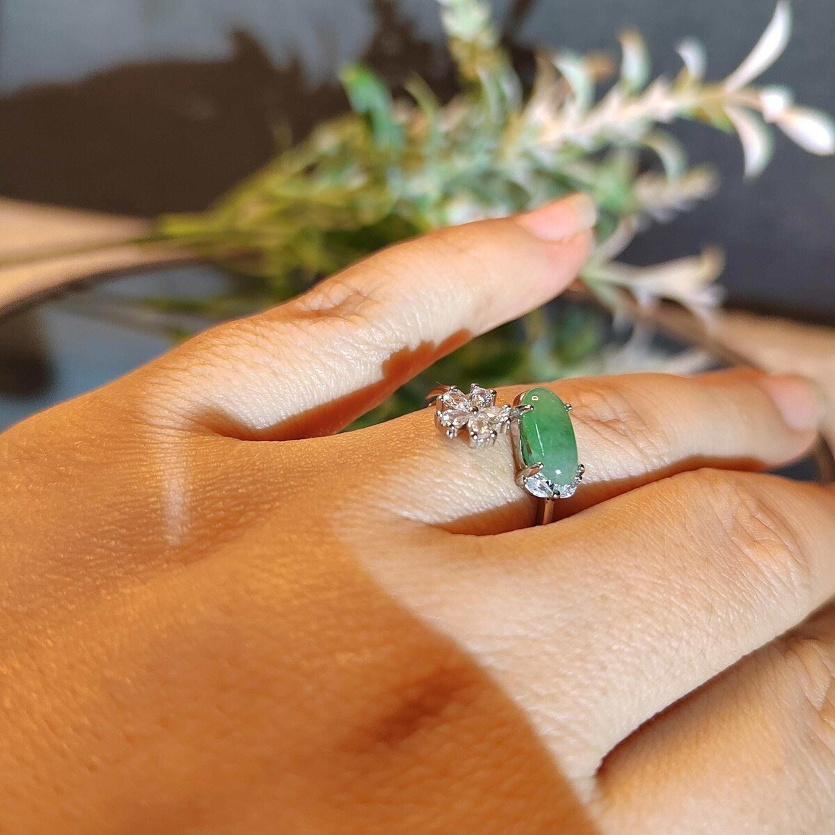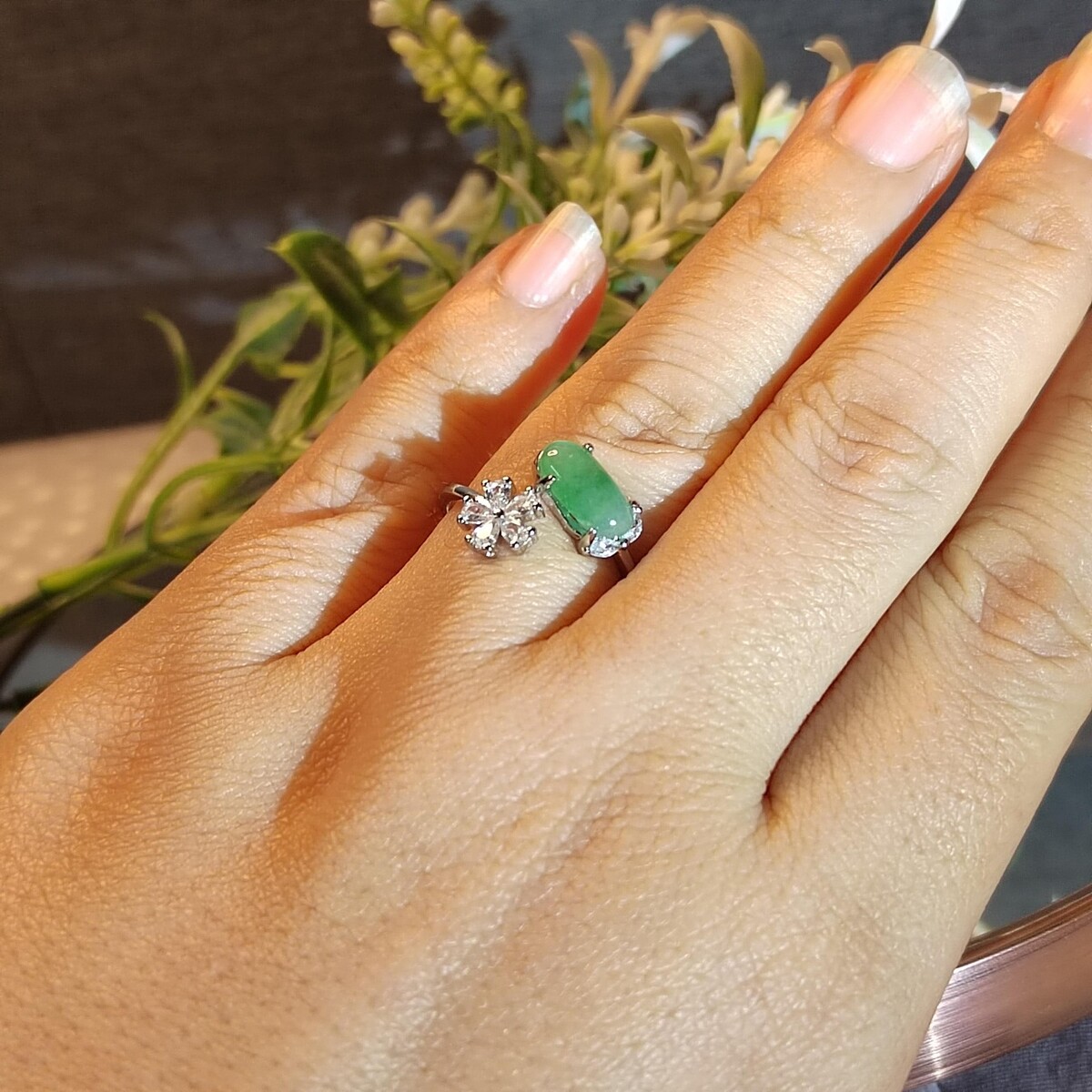 ? Certified Apple Green Jadeite Ring with Zircon AccentBurmese Origin Natural Untreated 18K White Gold-Plated CopperMinimalist Elegance ? Symbol of Prosperity ? Adjustable FitExperience the captivating beauty of certified Burmese jadeite?featuring a vivid apple green cabochon paired with a delicate zircon flower accent. Set in polished 18K white gold-plated copper, this ring blends nature?s brilliance with modern sophistication, making it a versatile piece for daily wear or special occasions. ? Product Highlights? Gemstone: Certified Natural Untreated Burmese Apple Green Jadeite? Stone Size: 10.6 6mm? Accent: Zircon flower motif (7.2mm)? Material: 18K White Gold-Plated Copper? Ring Size: Adjustable? Weight: Approx. 181g? Setting: Prong-set oval cabochon with floral accent ? Symbolism Benefits? ? Apple Green Jadeite: Symbol of vitality, prosperity, and emotional clarity? ? Zircon Flower Accent: Represents grace, renewal, and feminine charm? ? Minimalist Design: Highlights the jadeite?s natural glow?perfect for modern and classic wardrobes? ? Natural Authentic: Untreated A-grade jadeite with unique variations in every piece ? Packaging Includes?? Authenticity Certificate?? Elegant Jewelry Box?? Jadeite Treatment Oil?? Jewelry Pouch?? Cleaning Cloth?? Zip-lock Storage Bag?? Free Worldwide Shipping with Tracking ? Care Instructions? Avoid perfumes, hairsprays, and harsh cleaning agents? Store in the provided pouch or box to prevent scratches? Clean gently with a soft cloth; avoid abrasives? Remove during swimming or strenuous activity to preserve plating
