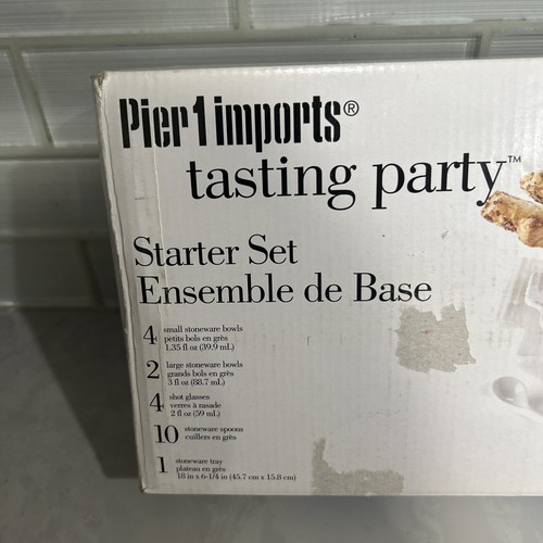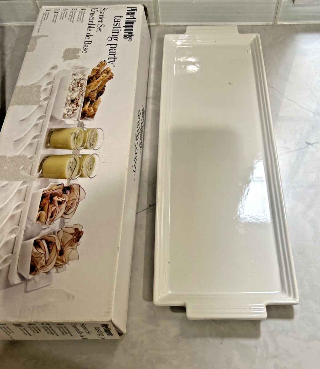 This is an exquisite Pier 1 Imports 5 piece Tasting Party Tray Starter Set in the Tasters pattern. The set includes a white porcelain tray and sample tasters that are dishwasher safe. Perfect for serving appetizers or small bites, this set is ideal for hosting tasting parties. Made in China, this brand new set is a stylish addition to any kitchen or dining area.