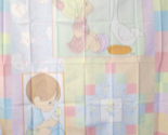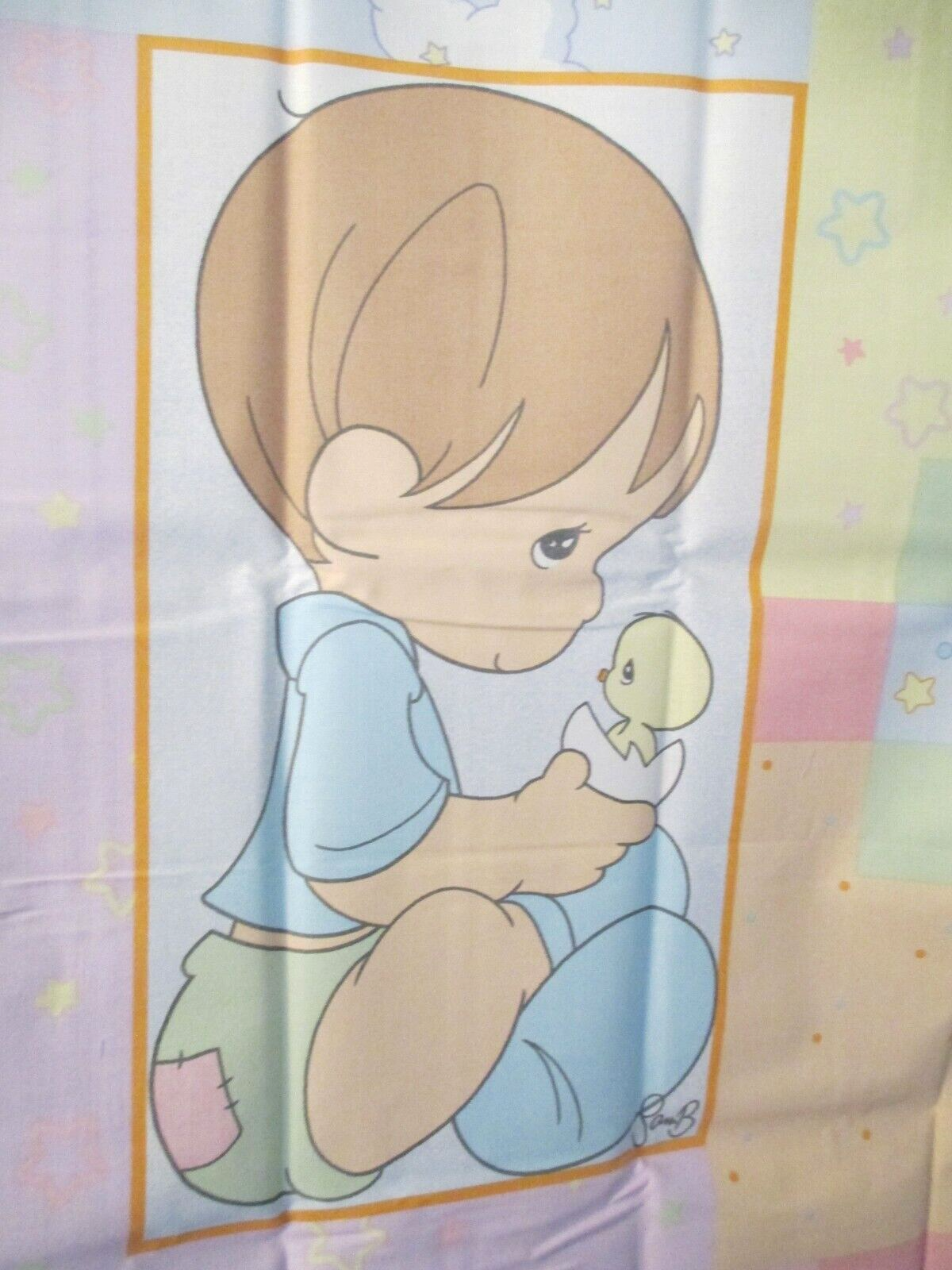This listing is from Spectrix featuring Precious Moments vintage fabric from 2004 (photo 6); a baby quilt panel featuring a blonde girl and a brown-haired boy sitting in separate blocks. The girl is staring down a goose and the boy is holding a newly-hatched chick. These are in pastel colors of yellow, pink, mint green and blue. The design is a mock crazy quilt.