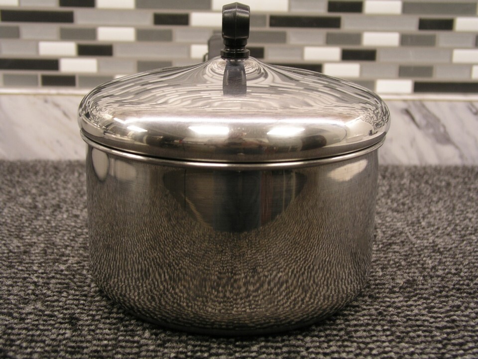 Used Farberware aluminum clad stainless steel 3 quart sauce pan with the lid made in the USA. It is in good condition with some light scratches and marks on the inside and outside from normal use and storage. The handle and knob are in great condition. The handle WILL BE REMOVED for shipping and requires a screw driver to reattach.