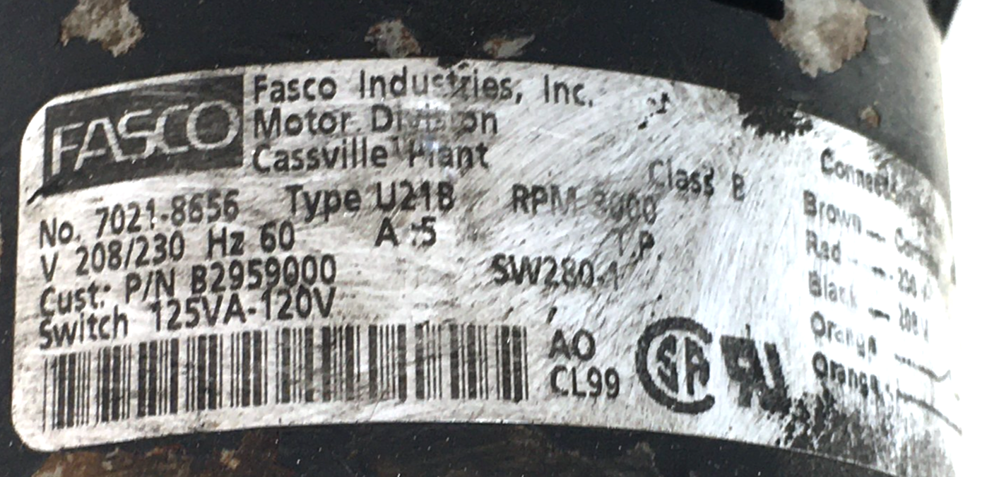 This is FASCO 7021-8656 Draft Inducer Blower Motor Assembly B2959000 208/230V 3000 RPM used part.