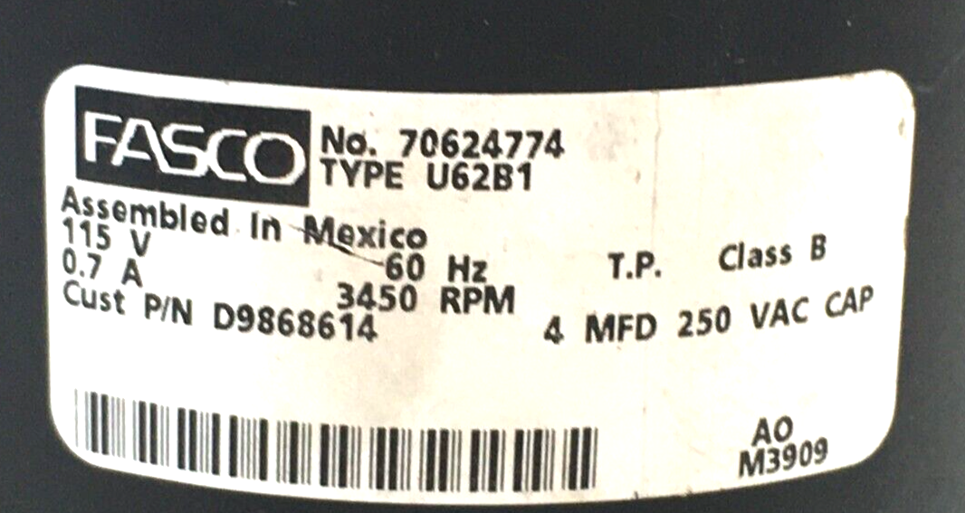 This is FASCO 70624774 Draft Inducer Blower Motor Assembly D9868614 115V 3450 RPM used part.