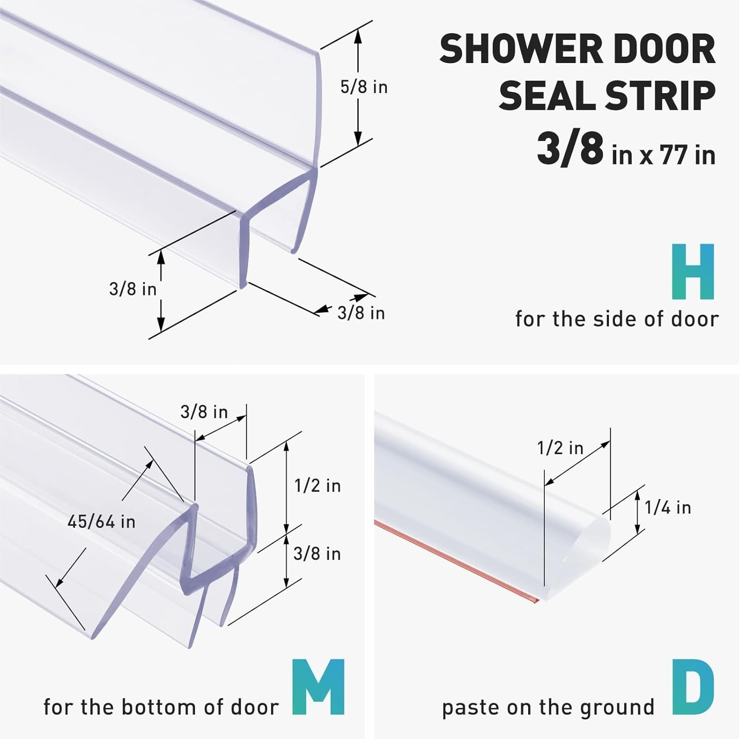 - Shower door side seal H Type * 2,shower door bottom seal M Type * 1,shower dam D Type * 1, D type can use with M Type seal,filling more door bottom gaps between the thresold
