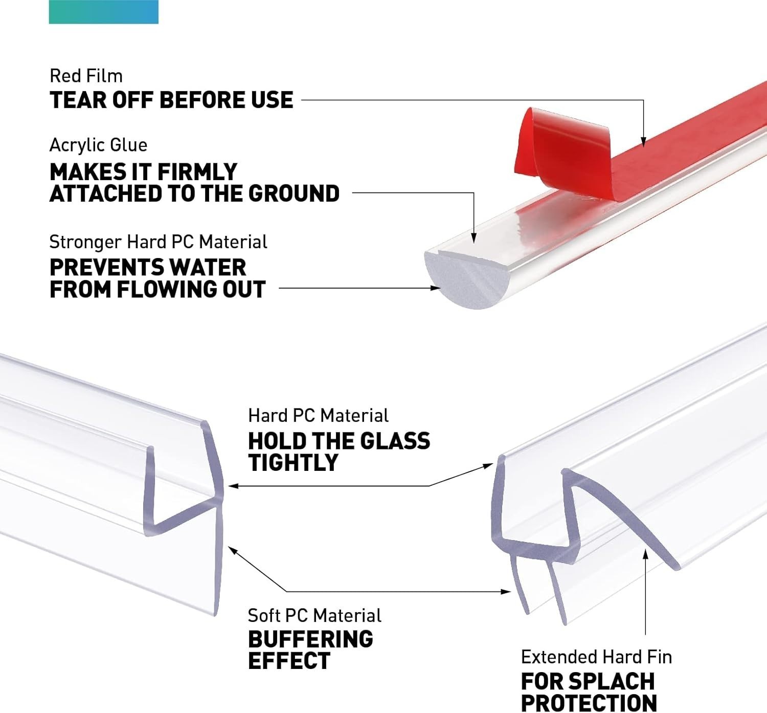 - Size: 1/2"W x 1/4"H ,made of acrylic,with half round design,it can work on flat floor,seal 1/4" gap,make water back into shower, (WARM TIPS: Before install please tear off the red adhesive backing film)