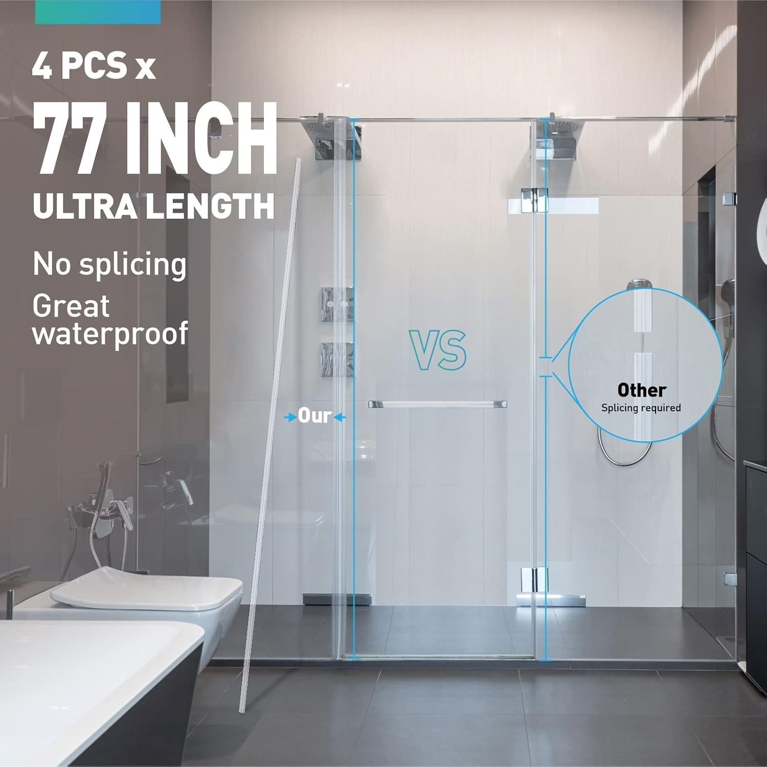 No splicing,no micro gaps,great waterproof,77 inch each, easy to install,shower door seal strip creat a great water barrier of your door and get a dry shower floor