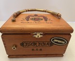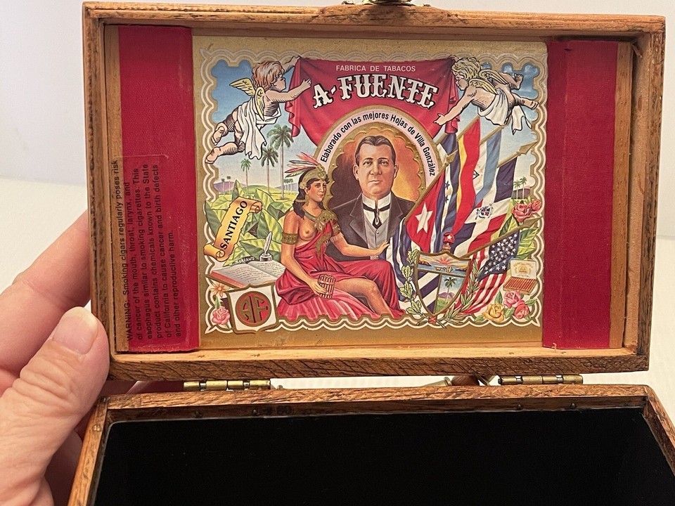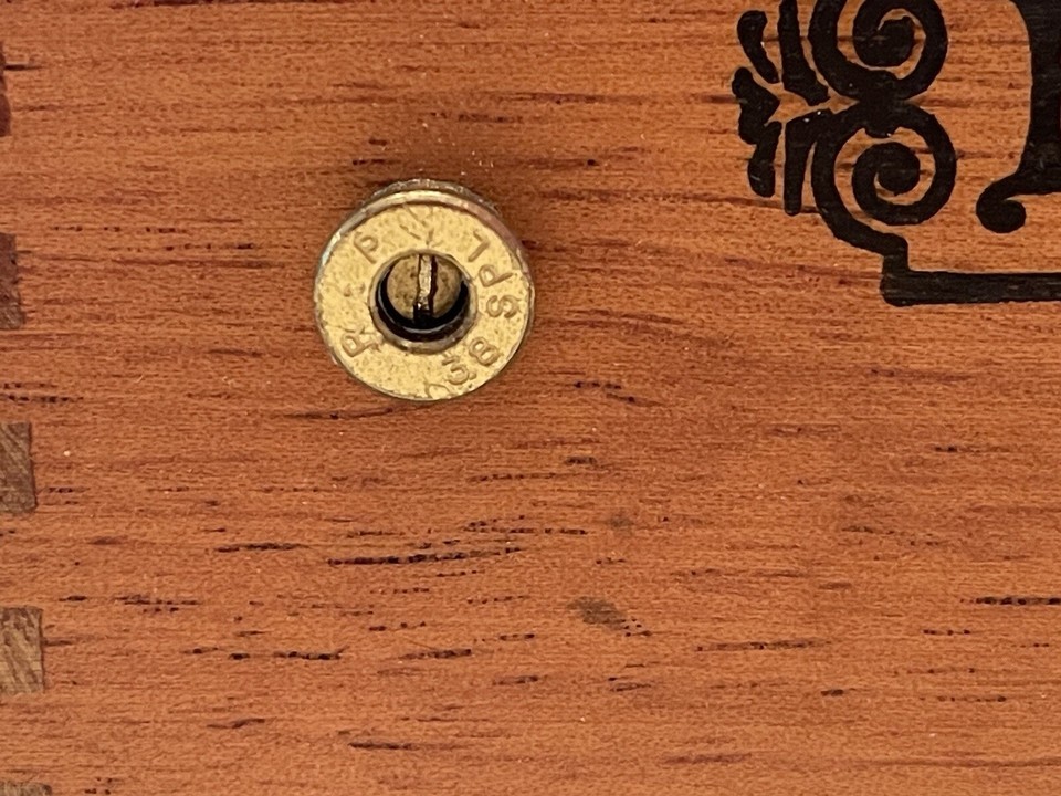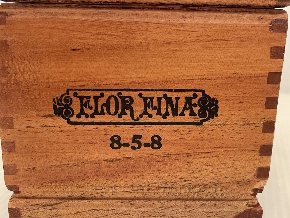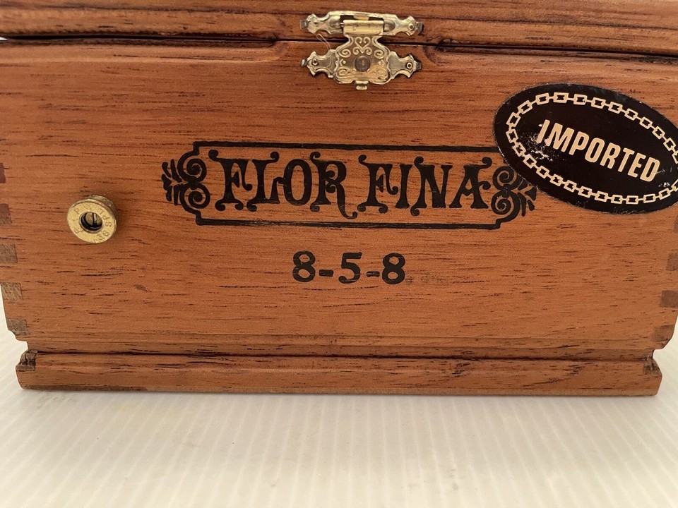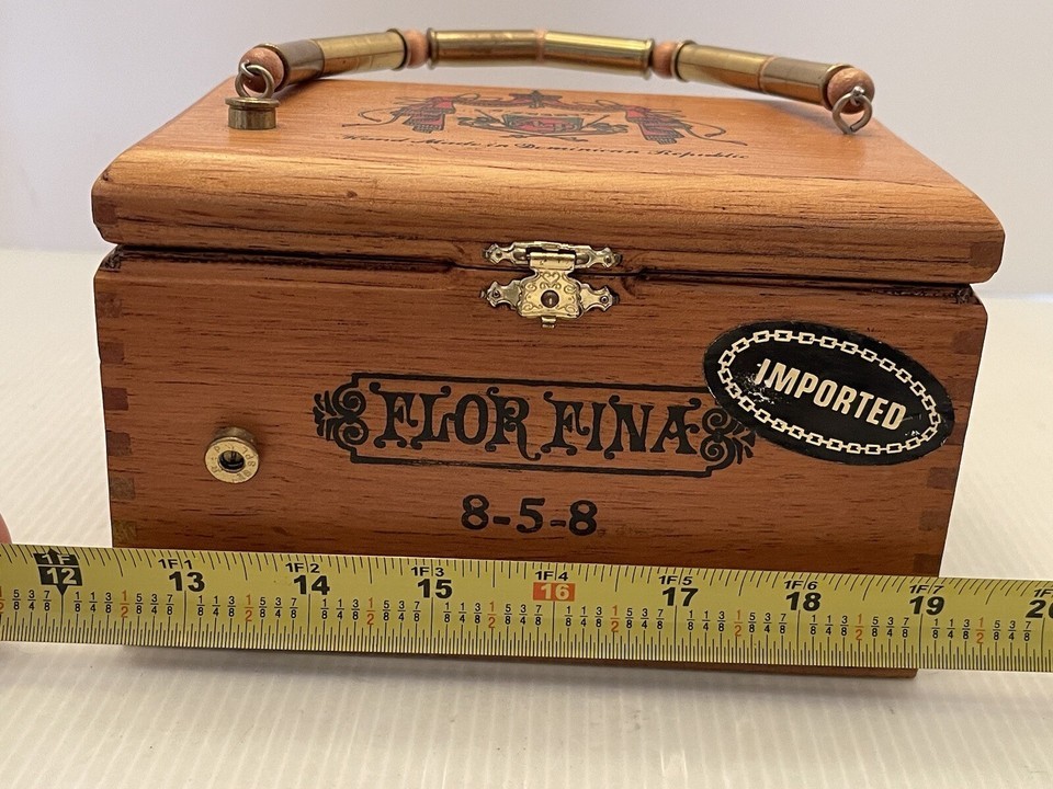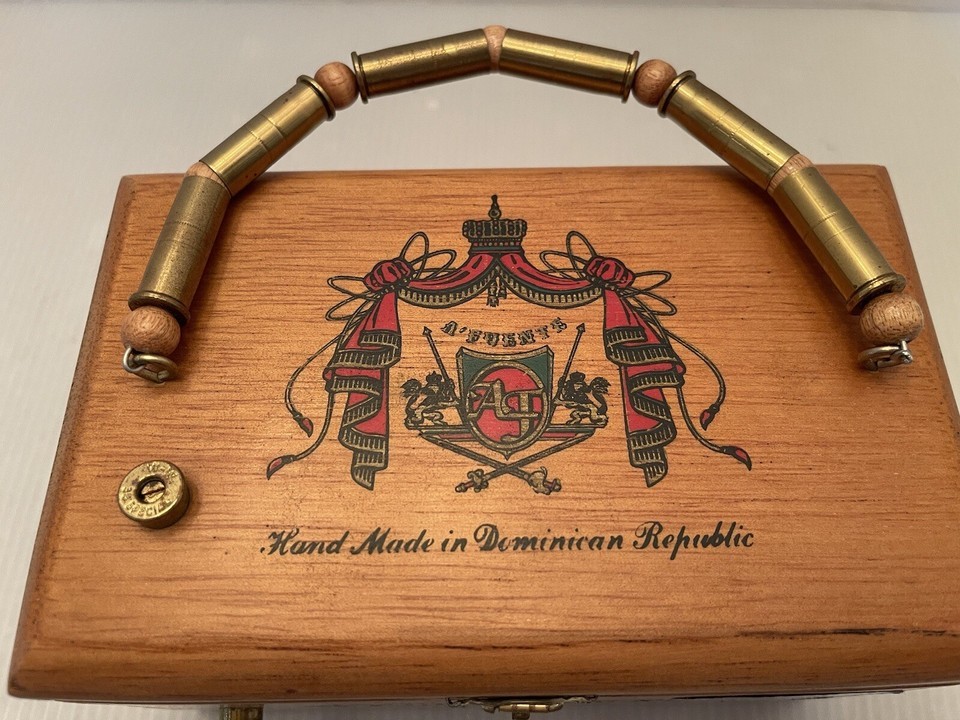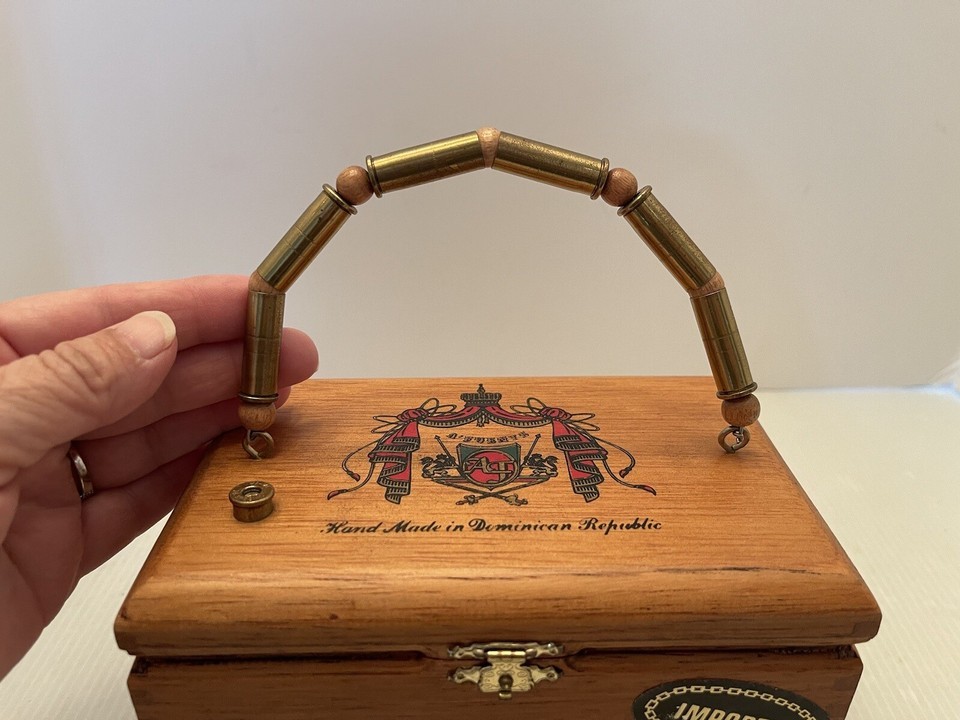 This vintage wooden cigar box from Arturo Fuente is a must-have for cigar enthusiasts and collectors alike. Handle is made with 38 Special Bullet Shells. The hinged lid allows for easy access and the box is adorned with the FLOR FINA 8-5-8 design, making it a unique and eye-catching piece. The box is perfect for storage or display and is sure to impress any guest in your home. It is a great addition to any collection and a wonderful conversation starter. FLOR FINA Arturo Fuente Cigar Box Purse Made with 38 Special Bullet Shell's