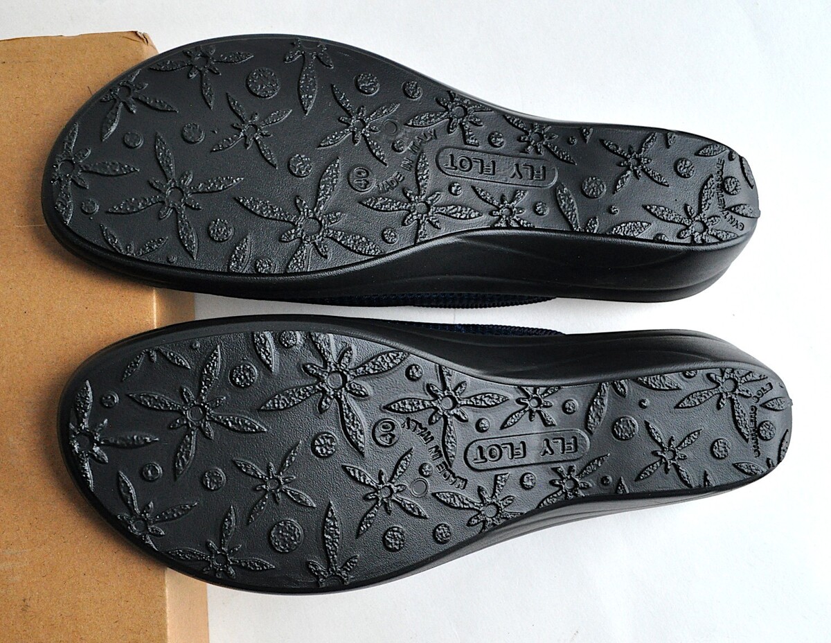 Fly Flot slip-on open-toe comfort mules in navy microfiber mesh with black wedge soles. Leather insole, anti-shock cushioning, and flexible sole with 1 5/8" wedge heel. Great around the house or out and about. Fly Flot seems to have discontinued this particular style; I found only the clog version on their site.