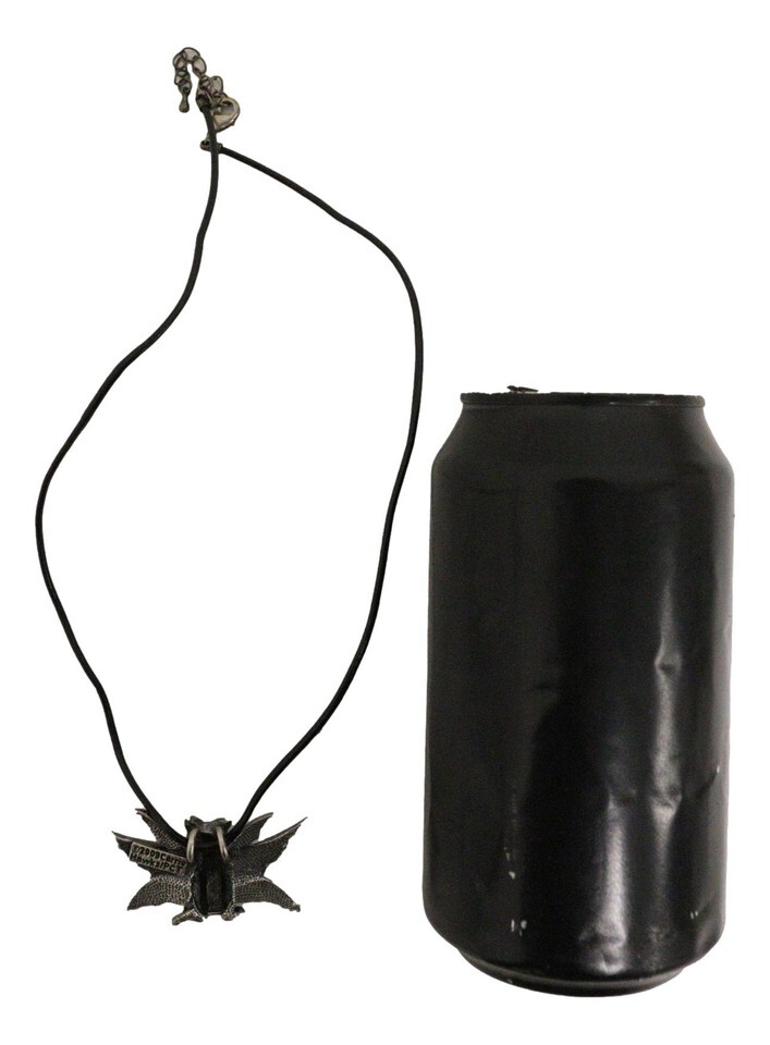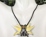 ? This Cat Fairy pendant measures approximately 1"High By 2" Wide. The rubber necklace cord is about 15" Long.