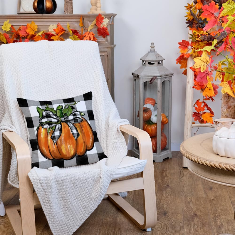 Fall Pillow Cover 18X18 Inch Buffalo Plaid Pumpkin Bow Decor Autumn Seasonal Pillow Case