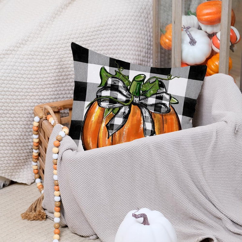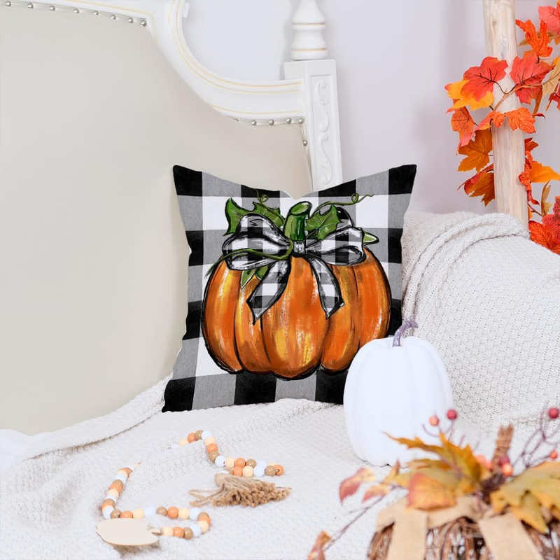 - Fall Pillow Cover 18X18 Inch Buffalo Plaid Pumpkin Bow Decor Autumn Seasonal Pil