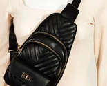 This stylish quilted crossbody bag features premium black leather construction with distinctive diamond-quilted texture that adds luxury appeal. The bag showcases elegant gold-tone hardware including zippers and turn-lock closure for secure storage. Designed with an adjustable crossbody strap for comfortable hands-free carrying, this versatile bag offers multiple compartments for organized storage of essentials. The compact yet functional design makes it perfect for daily use, travel, or evening outings. The sophisticated black color and quilted pattern create a timeless aesthetic that complements both casual and formal outfits.