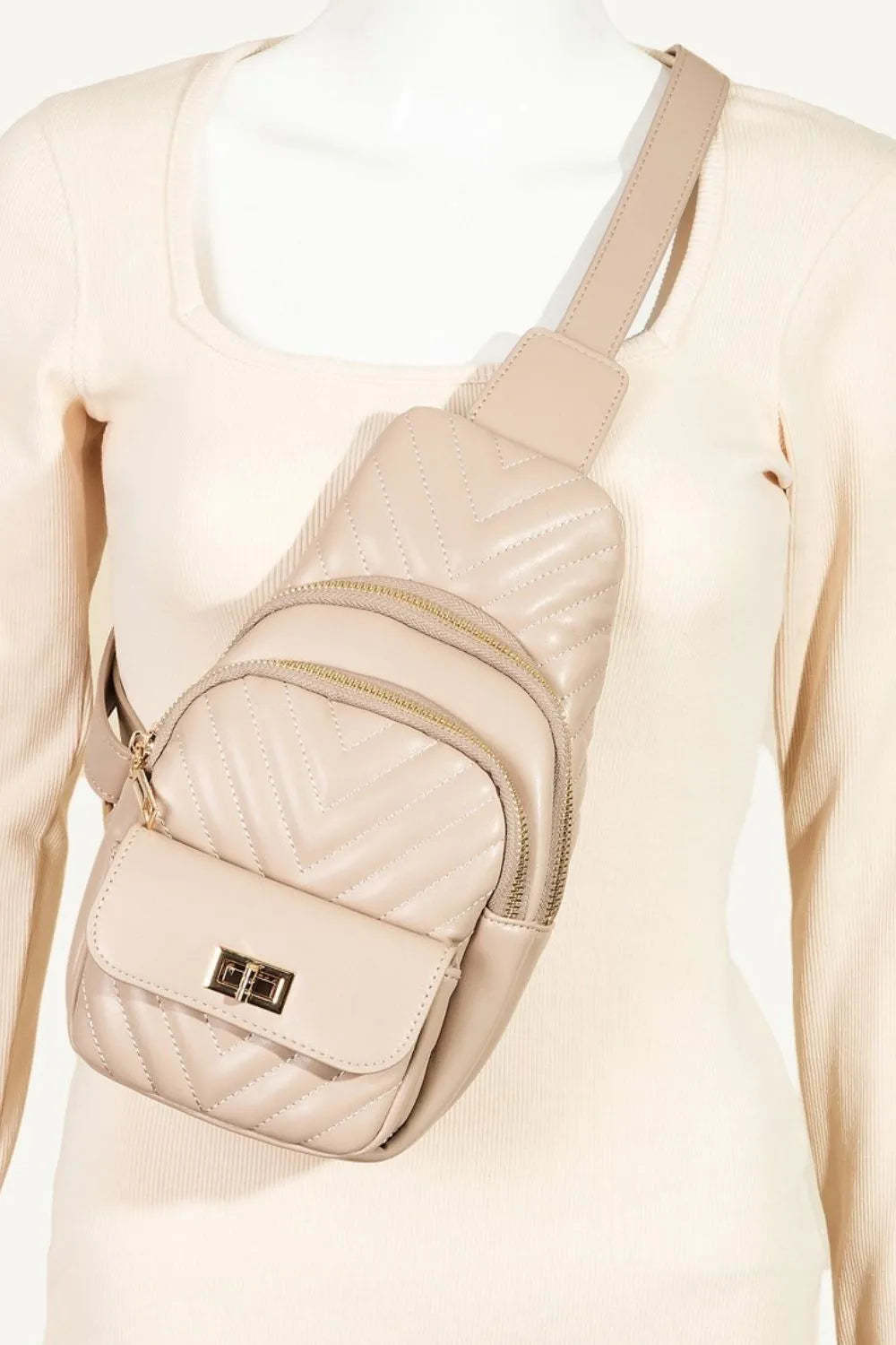 This stylish quilted crossbody bag features a sophisticated diamond-stitched pattern in a versatile nude beige tone. Crafted with premium synthetic leather material, it showcases elegant gold-tone hardware including zippers and turn-lock closure. The adjustable strap allows for comfortable crossbody wear or fashion chest bag styling. Perfect compact size for carrying daily essentials while maintaining a chic, structured silhouette. The quilted texture adds luxurious appeal while the neutral color complements any outfit. Ideal for fashion-forward individuals seeking both style and functionality in a versatile accessory.