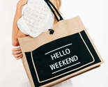 A stunning must have tote bag that is designed with a hello weekend burlap tote bag design. Perfect as a gift for a loved one!