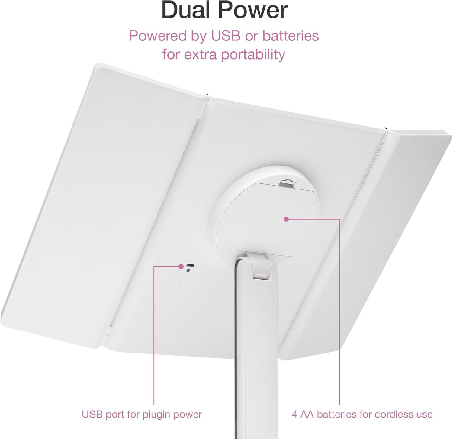 Natural Daylight LEDs - 2x brighter and softer illumination than the next best. 58 built-in dimmable LEDs closely mimic soft, natural sunlight providing you with true-to-life color-correct details. Wide Viewing Area - larger than average 3-panel ultra-reflective mirrors provide multiple viewing angles, so you always look (and feel) your very best! 180 rotation, fully adjustable to any desired position. Exceptional Clarity - Our premium distortion-free glass is ideal for creating flawless makeup looks and hair styles while the 5x and 7x magnifications are perfect for close-up and detailed work. Travel Friendly - Mirror stands 12.5" (32 cm) tall and 13.8" (35 cm) wide, mounted to a detachable cosmetic organizer base for storage of your makeup, jewelry, and more! Three panel mirror easily folds for ultimate portability. Dual Power - Energy-saving smart LED lights turns off automatically after 30 minutes; powered by an included USB cable or 4 AA batteries.