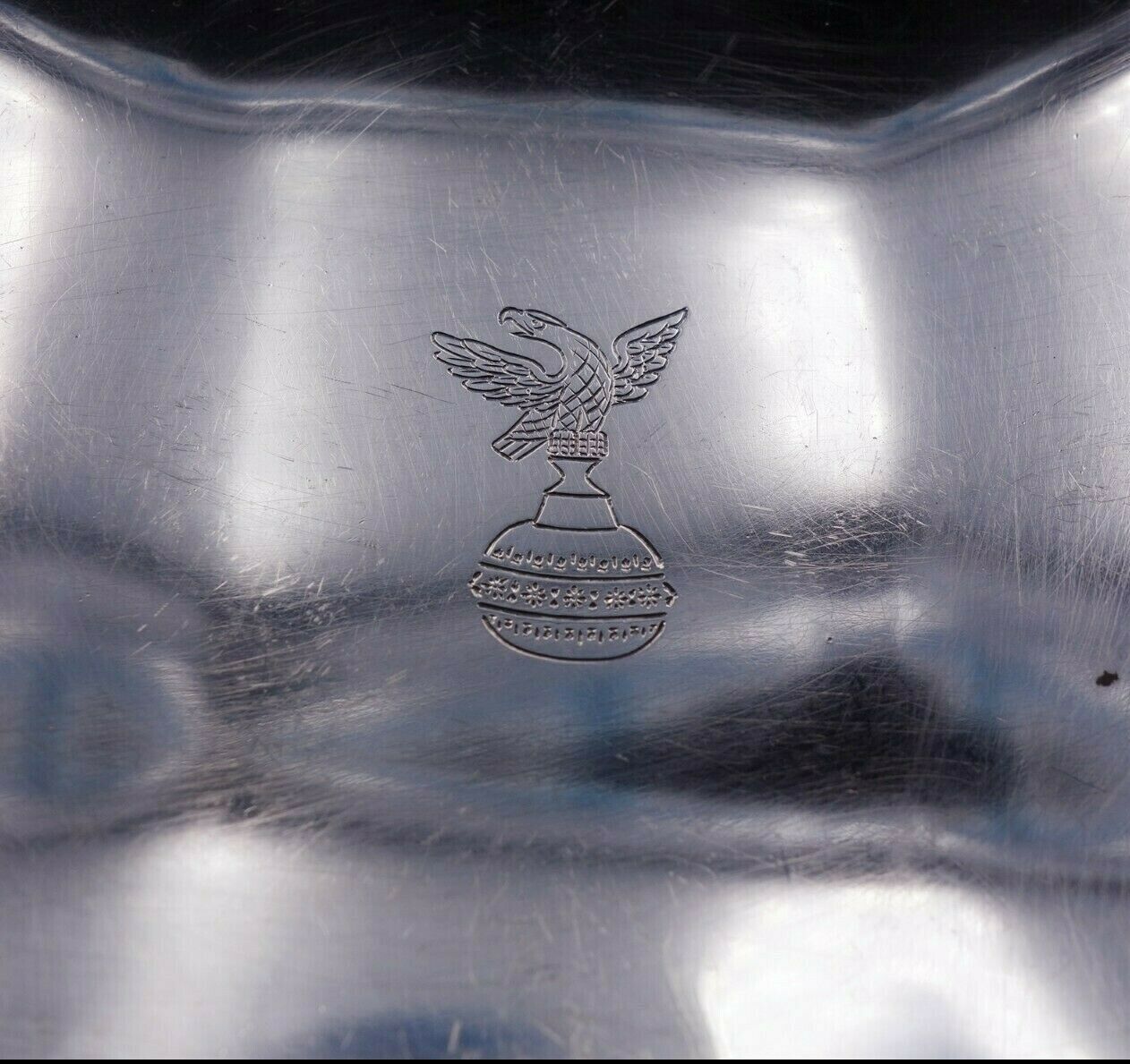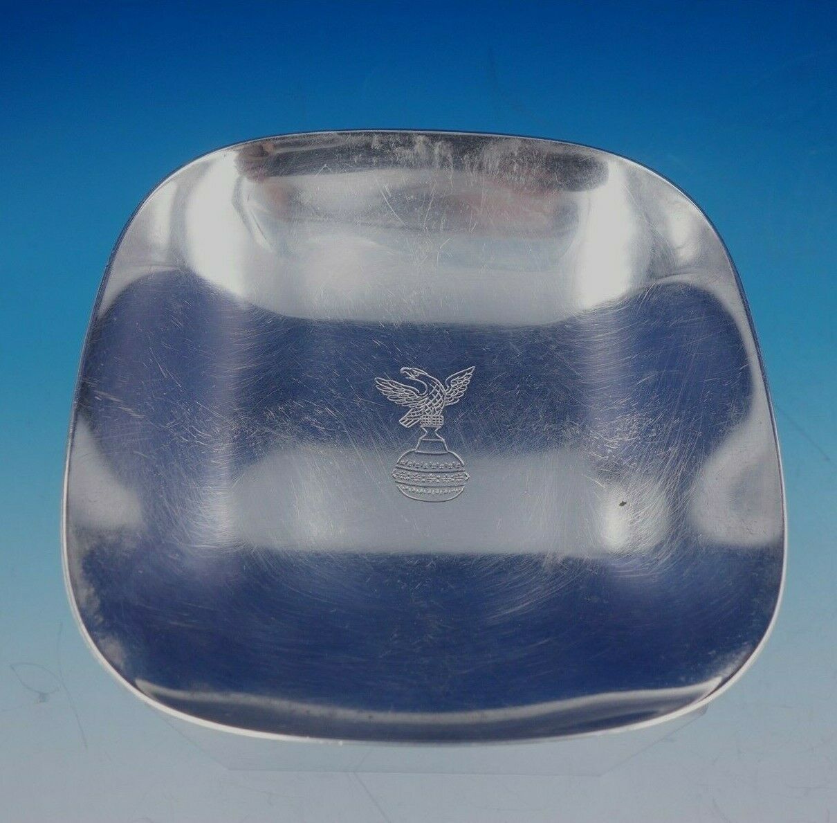 Gorgeous Faneuil by Tiffany and Co sterling silver square dish with rounded corners. This piece features an engraved eagle perched atop what almost looks like a Christmas ornament. The dish measures 4 7/8" x 4 7/8" x 3/4" and weighs 4.33 troy ounces. It is in excellent condition. Beautiful!