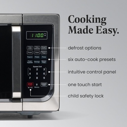 This microwave oven is the ideal size for office break rooms or home kitchens. One-touch cooking programs let you cook six of the most popular food items with the touch of a button. Choose from ten power levels up to 900. The large digital screen has a clock feature and can display a countdown timer in addition to the remaining cook time. The memory function lets you customize and save your favorite settings, and the large door has an easy-grip handle and child-safety lock.