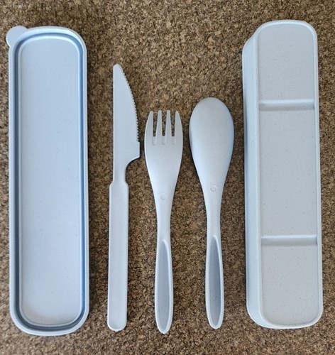 - Farielyn ~ Wheat Straw Fiber ~ 3 Pc. Cutlery Set w/Storage Box ~ BLUE SPECKLED