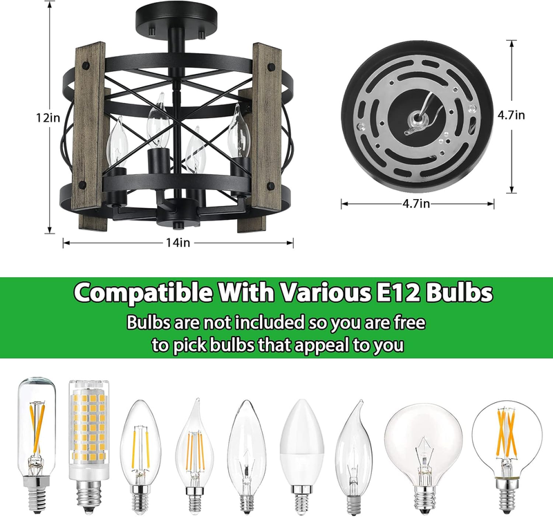 ?Compatible with E12 Bulbs?The ceiling lamp with 4 standard USA sockets is compatible with E12 base bulbs(bulbs are not included). Incandescent, LED and halogen bulbs are all suitable. And it is fully dimmable when it?s installed with dimmable bulbs(bulbs and dimmer switch not included). Max 40W for each bulb