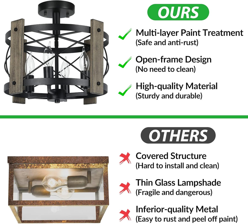 ?Durable for Use Anti-rust?The close to ceiling light fixture is made of high-strength metal with a stable structure, much more durable for long term usage. Covered with black and wood grain paint, the dining room light fixture will surely maintain its farmhouse appearance for many years without fading, rusting or corroding