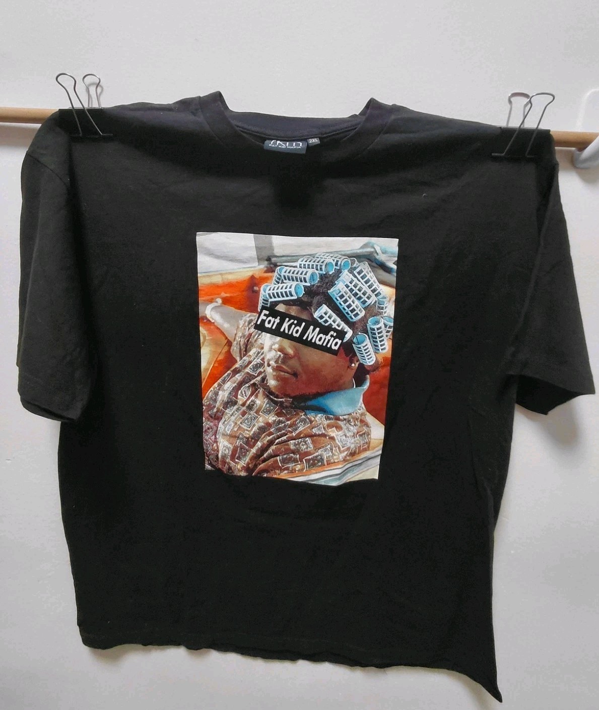 This black shirt features a graphic print of the Fat Kid Mafia character with a crew neck and short sleeves, making it a stylish and easy-care option for men who appreciate big and tall sizes.