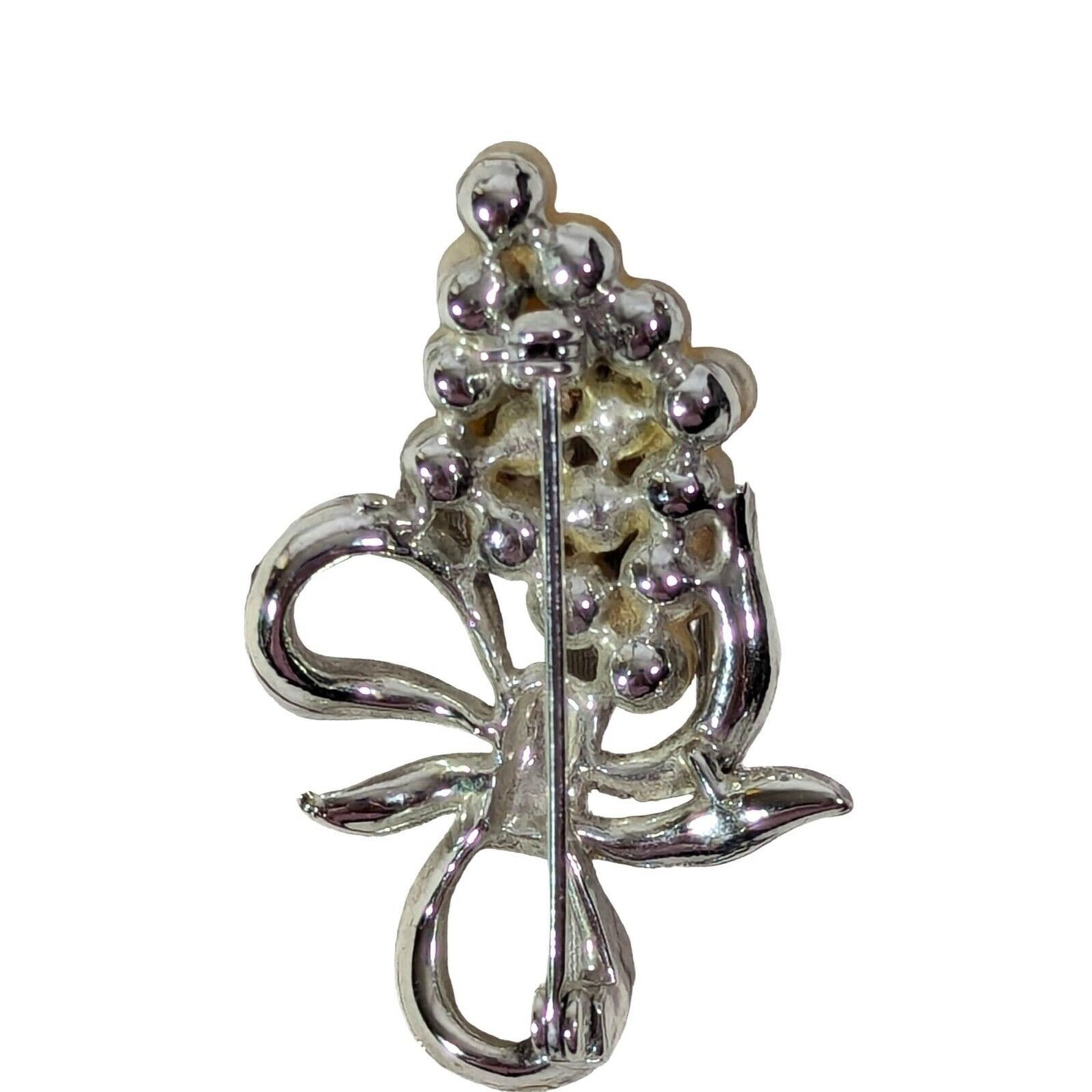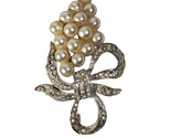 - Faux Pearl Cluster Brooch Silver Tone Rhinestone Ribbon Bow Metal Vintage 60s