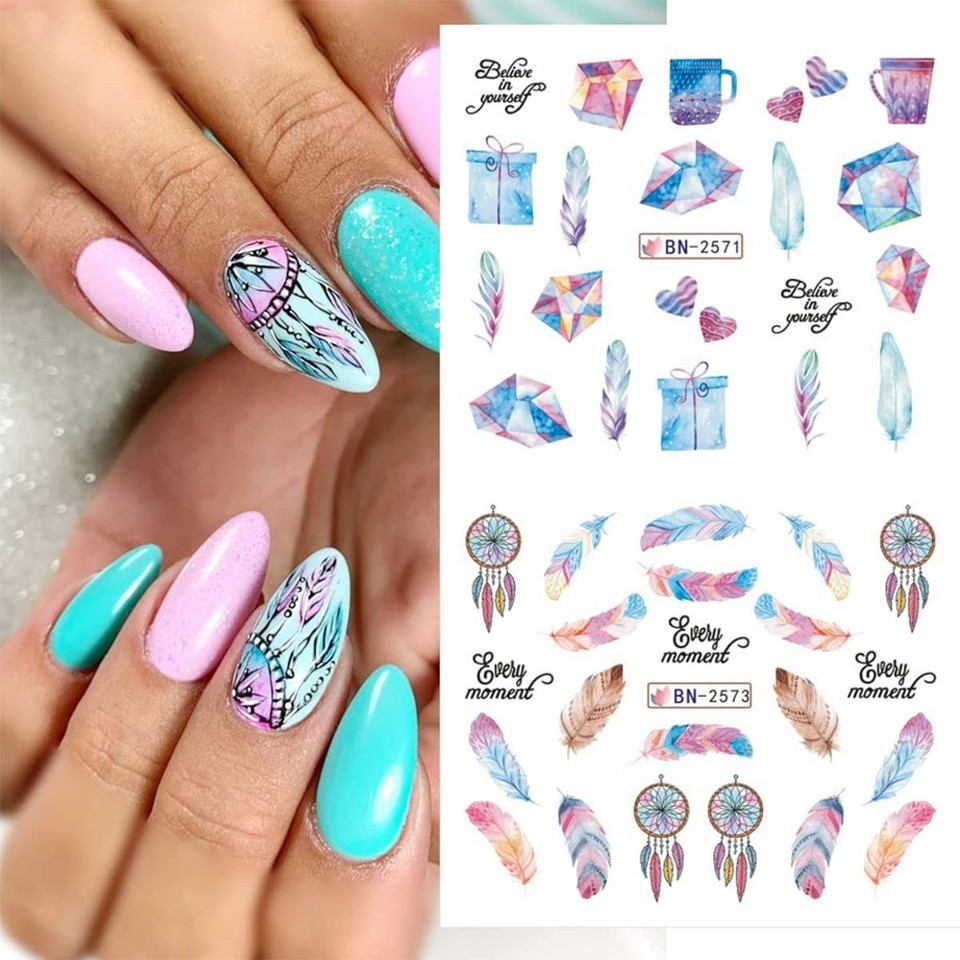 - Feather Nail Water Sticker Decals Dream Catcher Colorful 12PCS Nail Art