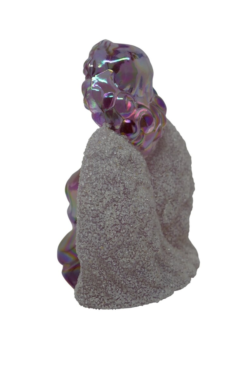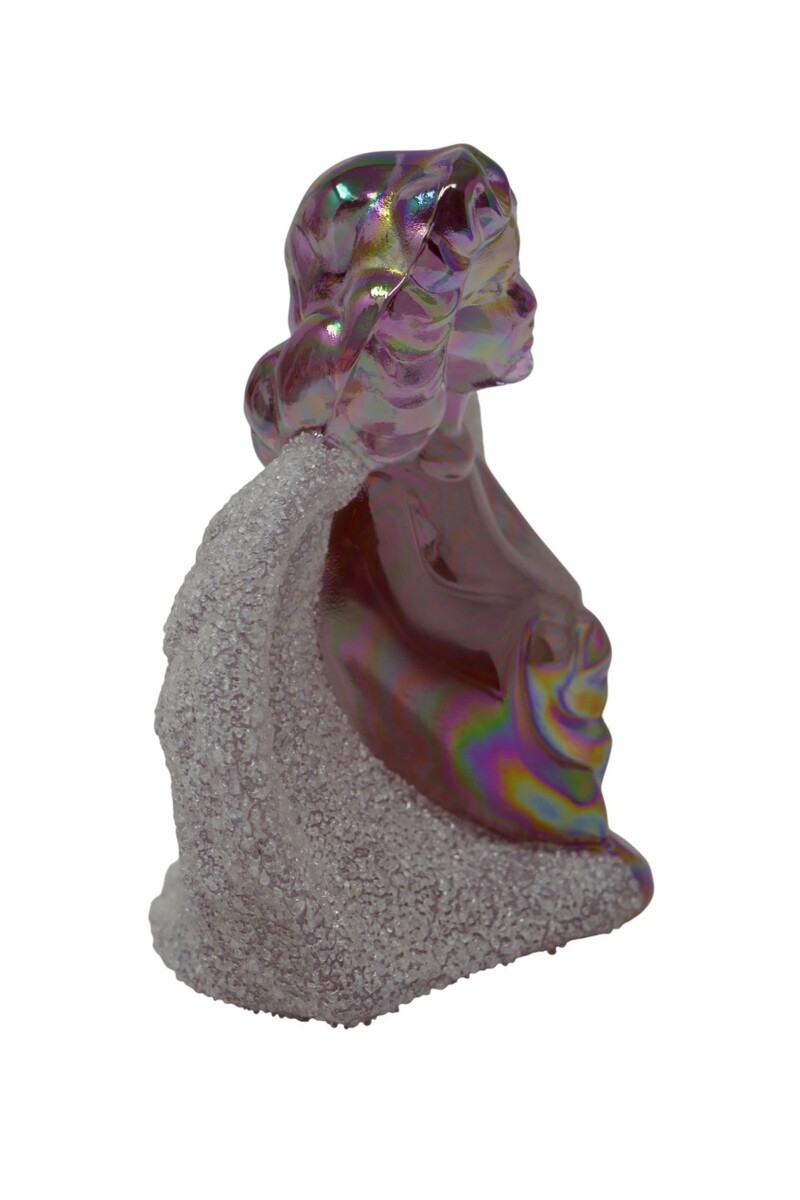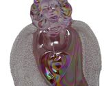 The Fenton Carnival Iridescent Glass Angel is a decorative figurine originating from the United States. This vintage piece features a pink iridescent pattern with glossy finish, showcasing intricate detailing and elegant design. Made of glass, this original Fenton creation stands at 3.5 inches tall and 3 inches wide, making it a beautiful addition to any collection of decorative pottery and glassware.