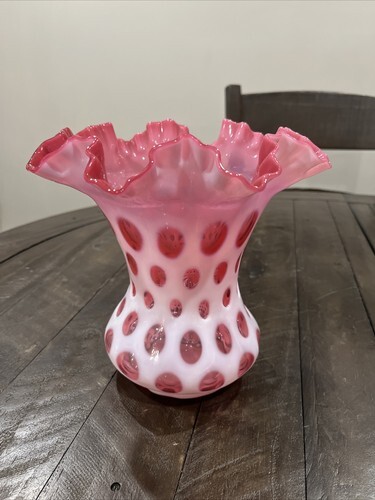 This exquisite Fenton Cranberry Opalescent Coin Dot vase is a beautiful addition to any Mid-Century Modern collection. Hand blown by skilled artisans, this vintage vase features a stunning cranberry color with a delicate ruffled edge. The intricate Coin Dot pattern adds a touch of elegance and uniqueness to this piece of art glass.