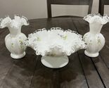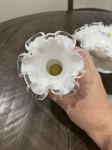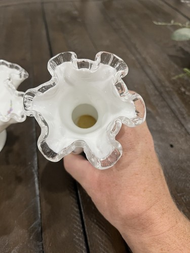This beautiful set of Fenton Silver Crest Violets in the Snow double crimp compote vases is a must-have for any collector of stunning glassware. The vases are made of high-quality glass with a milk glass production style, and are hand-blown to perfection. The crimped style and intricate violets design add a touch of elegance to any room.