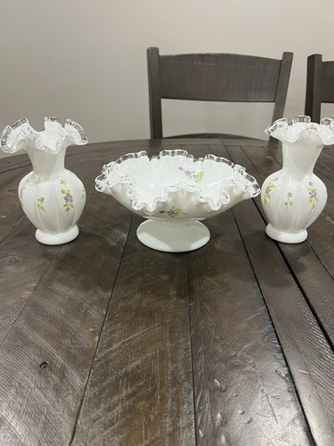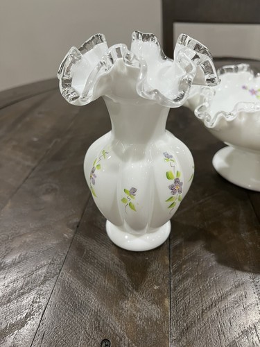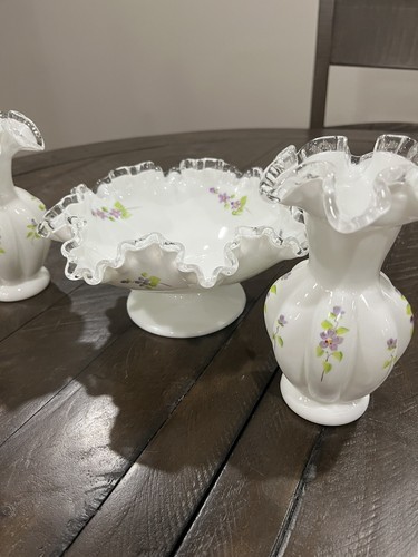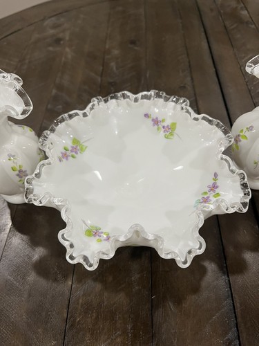 - Fenton Silver Crest Violets In The Snow Double Crimp Compote Vases Set Signed