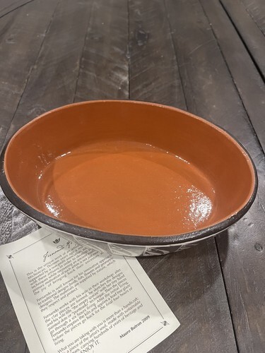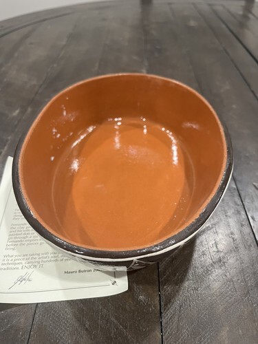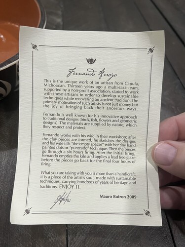 This Mexican art pottery bowl by Fernando Arroyo features a handcrafted design, showcasing traditional Mexican craftsmanship. The bowl is adorned with a fish motif in black, white, and red colors, reflecting the vibrant and colorful aesthetics of Mexican art. The redware technique used in creating this piece adds to its authenticity and cultural significance within the Mexican art pottery tradition.