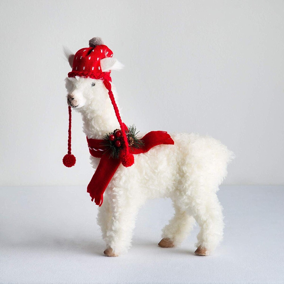 Festive Llama Knit Hat and Scarf Materials: Plush Faux Fur, Wood Measures: 15" x 6.75" x 20" Seasonal colors and a soft, cuddly texture bring a childlike whimsy to table settings, hallway decorations, and more