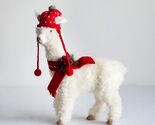 Festive Llama in Knit Hat and Scarf Fur Covered Wood Statue 16.5" H