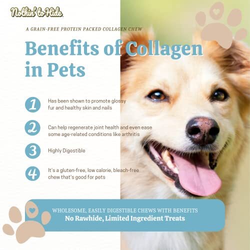 Bullet point: The Benefits of Collagen - These delicious treats are the perfect supplement to your pooch?s meal! Collagen for dogs has been shown to promote glossy fur, healthy skin and nails. Adding collagen to your pet's diet can help regenerate joint health and even ease some age-related conditions like arthritis.