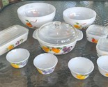 14 piece set of Fire King Anchor Hocking Fruit Pattern Milk Glass (manufactured from 1955-1961) features a mid-century modern design with a white color and a painted fruit pattern. Crafted from milk glass, this set is a great addition to any collection of Fire-King products, showcasing the unique and stylish design of the era. Set is in mint condition with little to no signs of use. Set includes: 1 Large, 1 Medium and 4 Small Bowls. 1 Large refrigerator casserole style Bowl with 1 Lid. 1 rectangle shaped refrigerator container with 1 Lid. 2 square shaped refrigerator containers with 1 Lid each.