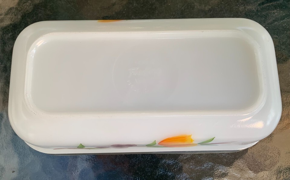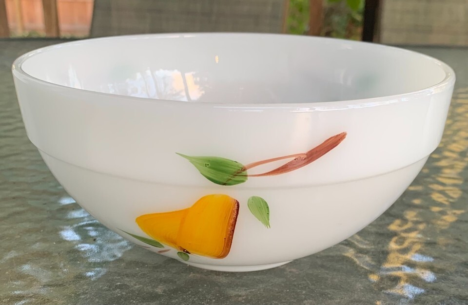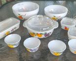14 piece set Fire King Anchor Hocking Fruit Pattern Milk Glass (manufactured from 1955-1961) features a mid-century modern design with a white color and a painted fruit pattern. Set is in mint condition with little to no signs of use. Set includes: 1 Large, 1 Medium and 4 Small Bowls. 1 Large refrigerator casserole style Bowl with 1 Lid. 1 rectangle shaped refrigerator container with 1 Lid. 2 square shaped refrigerator containers with 1 Lid each.