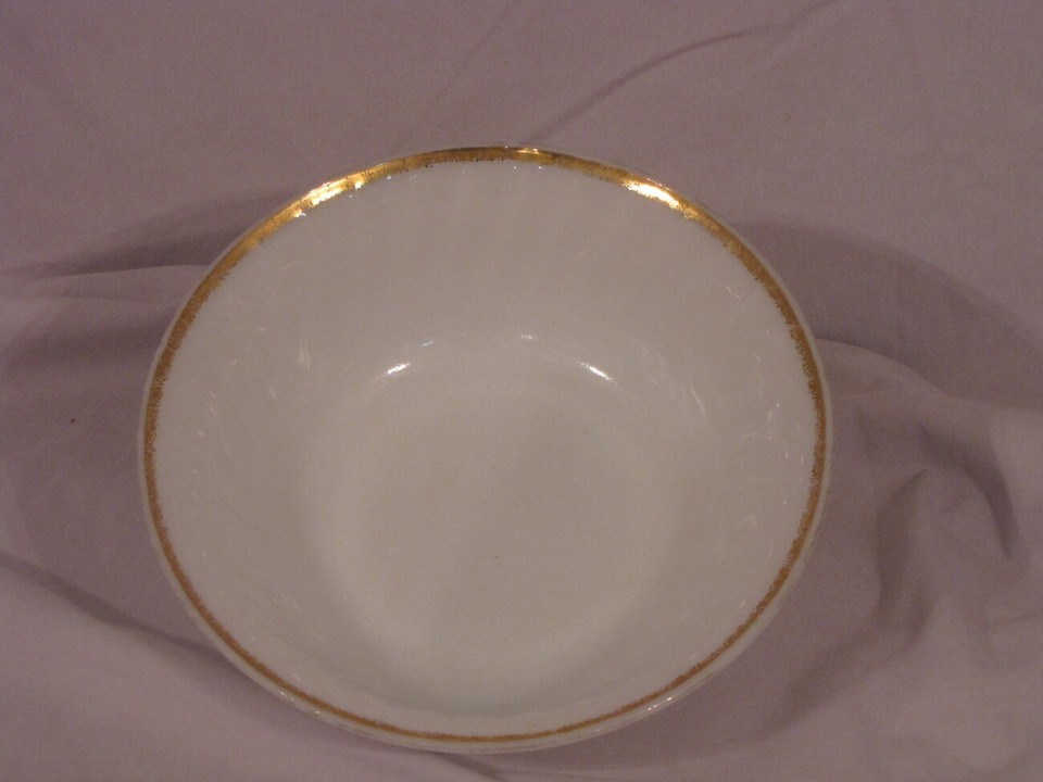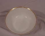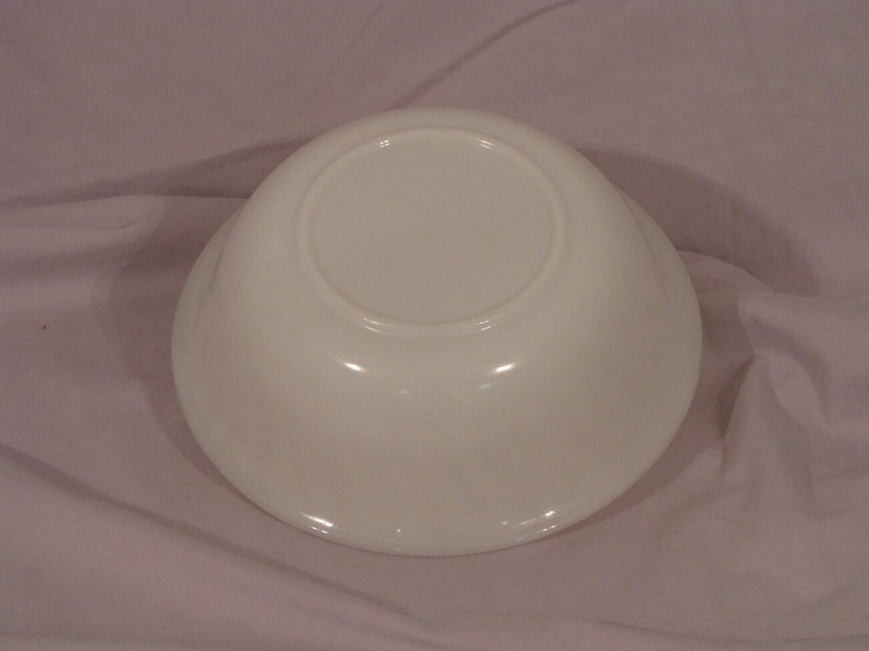 Offered for sale is a Fire King Oven Ware serving bowl. The bowl is Made in USA. It is white with a swirl design and gold trim. The bowl is in excellent condition with no chips, cracks or crazing. The bowl does have lite utensil marks. The bowl measures 8". The bowl dates between 1951 and 1960.