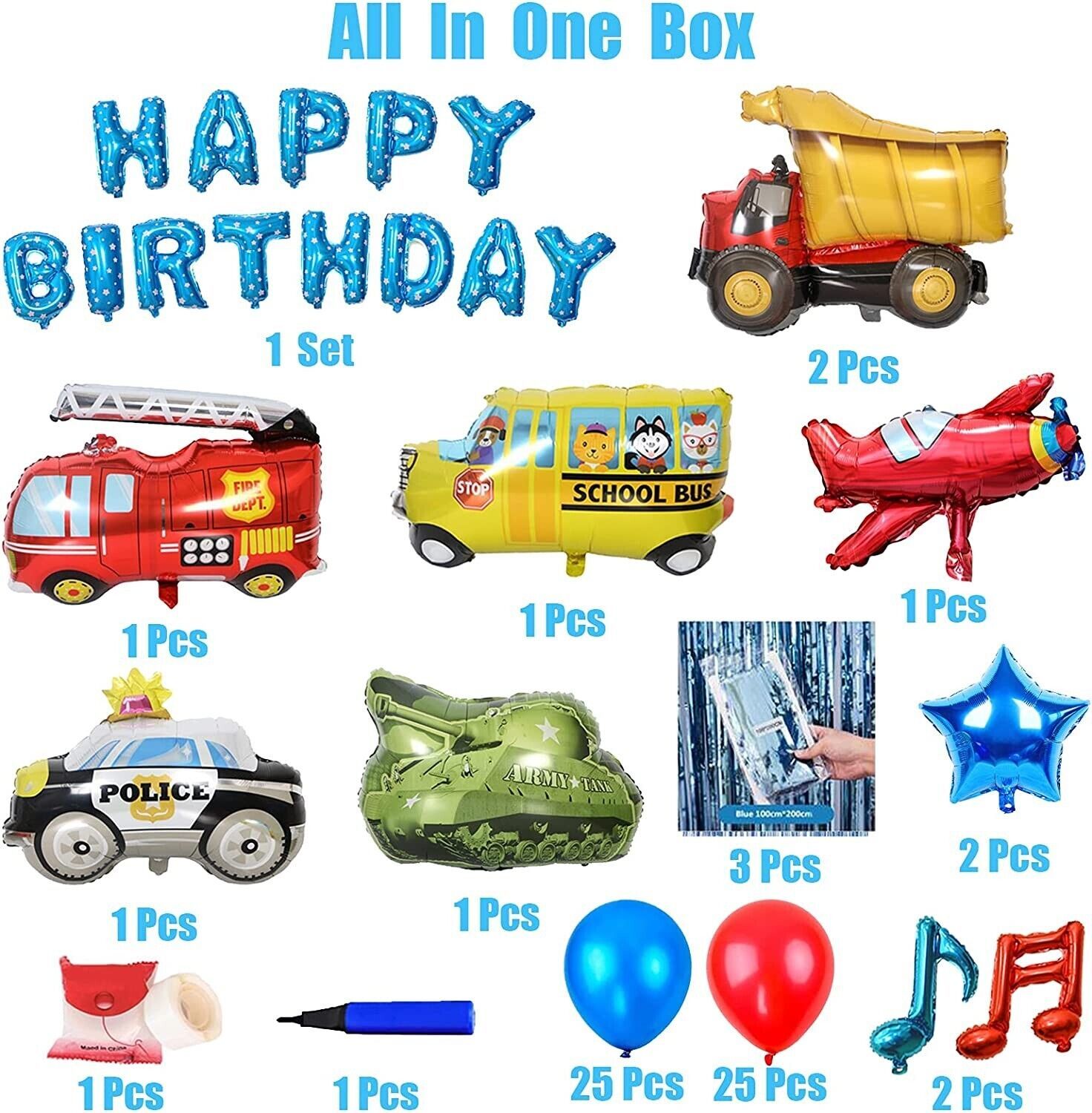 Vehicles Theme birthday set include: 7 Pcs large-sized Vehicles balloons,?fighter x1, tank x1, school bus x1, fire engine x1, police car x1, Engineering vehicle x2) ,2 Pcs 10 inch star foil balloons, 2 Pcs Musical Notes balloons, "HAPPY BIRTHDAY DAY" Banner, 50 Pcs Red and Blue latex balloons, 3 Pcs party Party Curtains and Pump related tools.
