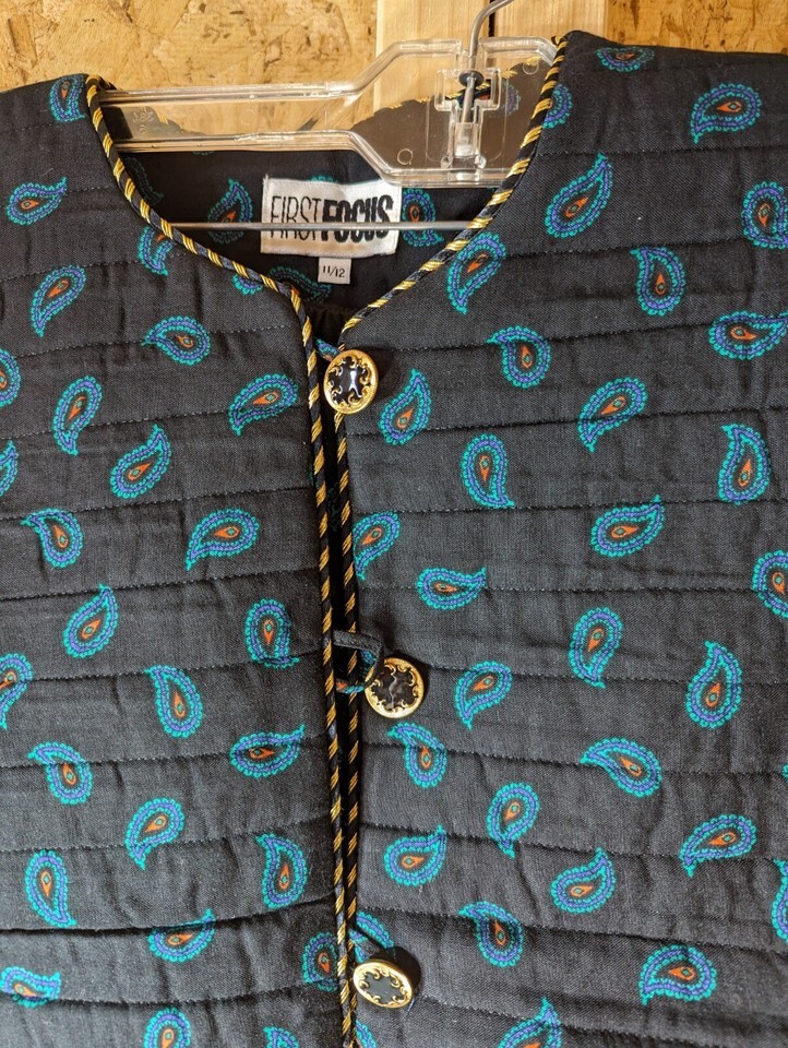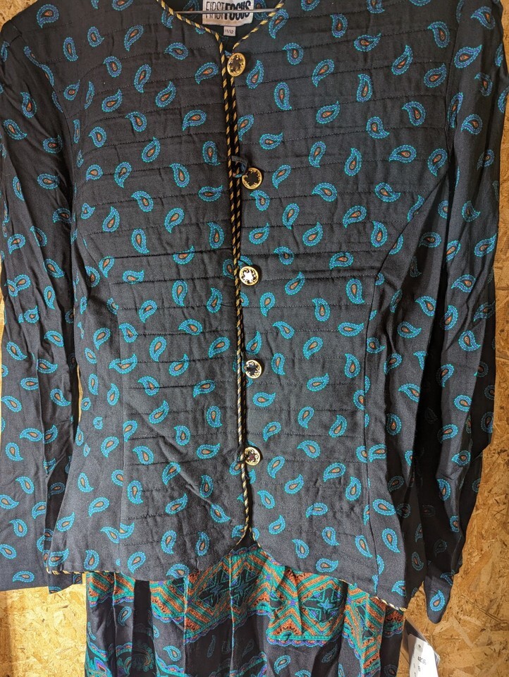 This vintage two-piece outfit from First Focus features a long sleeve dress shirt with a round neckline and button closure, accented with pleats and shoulder pads. The skirt is a pleated multicolor polyester blend in size 11, with a comfortable and durable rayon and polyester fabric type. The set includes both pieces and is perfect for any occasion, whether dressed up or down.