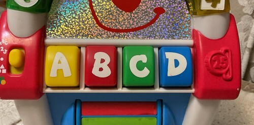 "This friendly Jukebox is ready to rock 'n bop and help baby learn with two fun-filled settings! With the push of a button, one setting teaches about letters and numbers; the other, colors and shapes. Baby can also spin the roller to enjoy four different styles of music as lights dance to lively tunes! Features an On/Off switch and volume control."