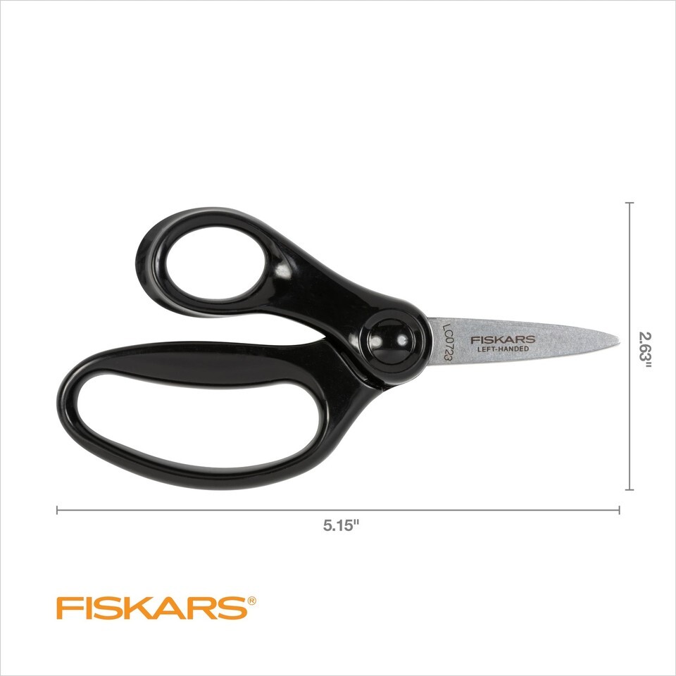 INCLUDES: 1 pair 5" Fiskars Left-Handed Pointed-Tip Kids Scissors in black; Lifetime warranty