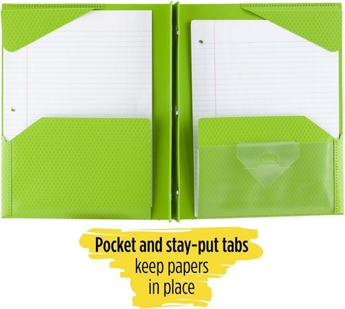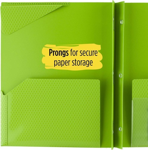 Neatly organize all your papers including class notes, homework assignments and class handouts in this Stay-Put Pocket and Prong Paper Folder. Folder has two horizontal pockets and stay-put tabs let you tuck in the page corners so the papers don't move while in the folder. The three prongs keep hole punched papers in place. Take the durable folder between classes and back and forth from school to home without worry.