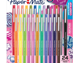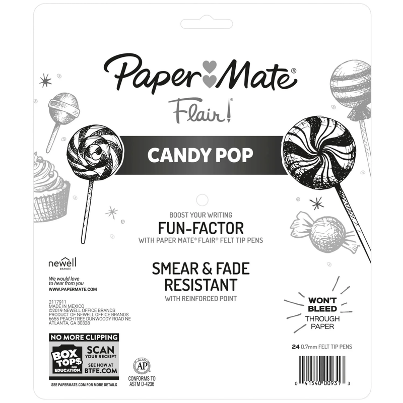 Paper Mate Flair Felt Tip Pens, Medium Point, Limited Edition Candy Pop Pack, Box of 24 Add a blast of fun to all your writing with bright colors Medium Point felt tip (0.7mm) produces clear, expressive lines to match your personality Smear- and fade-resistant, so smudges are officially history Water-based ink won?t bleed through paper so your writing stays put The point guard prevents the tip from fraying, so the party never stops Includes 24 Flair pens in assorted colors