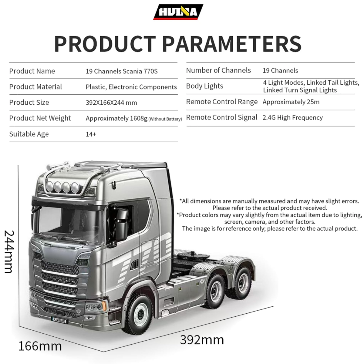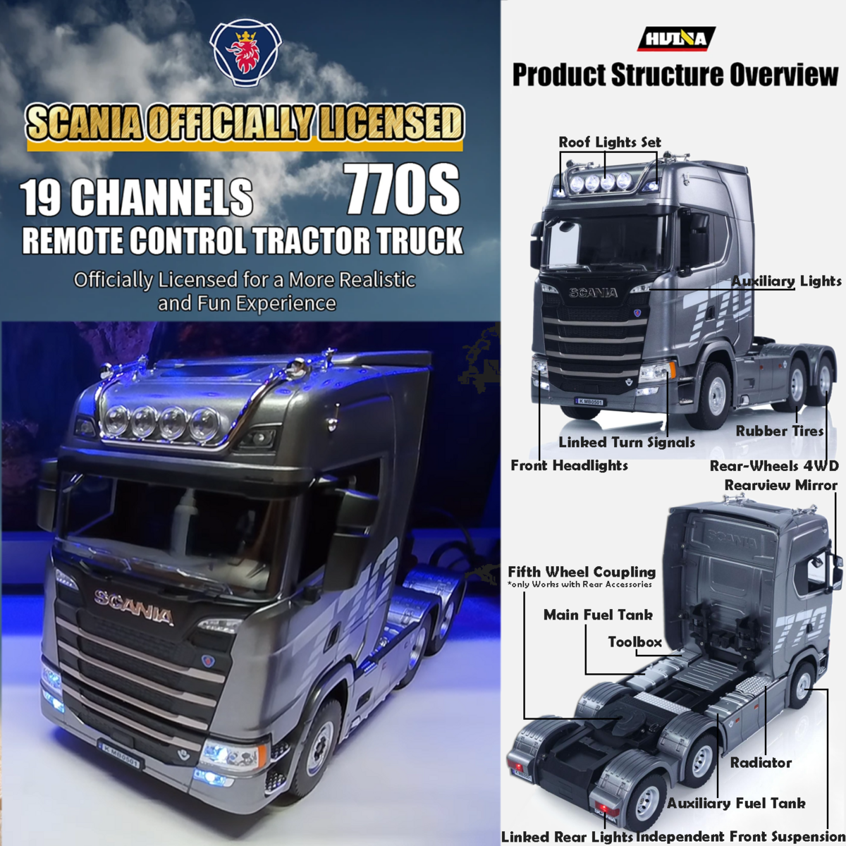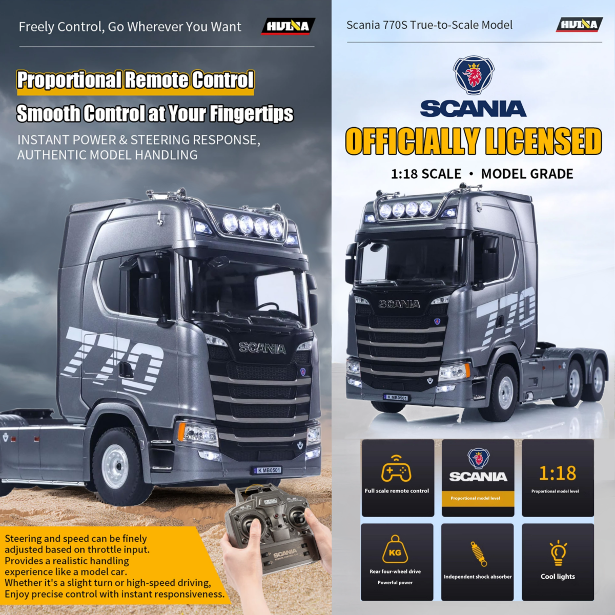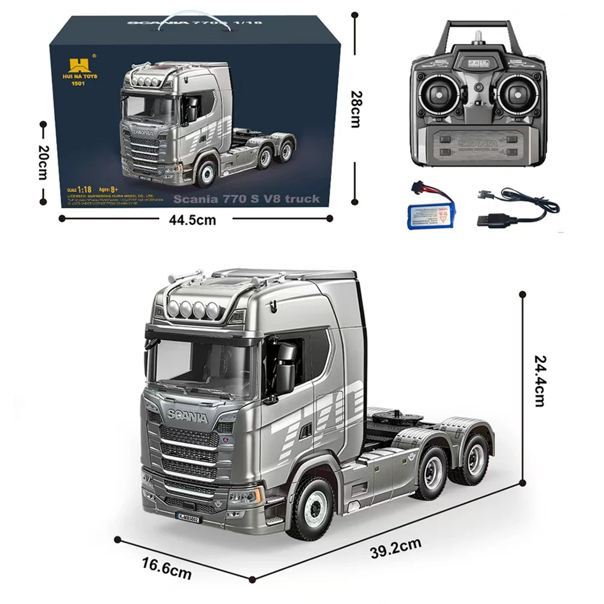The Huina 1/18 Scania 770S RC Semi Trairler Truck RTR bring the power and precision of heavy-duty transport to your fingertips with the Officially Licensed Huina Scania Truck, a 1/18 scale radio-controlled tractor truck crafted for realism, performance, and fun.