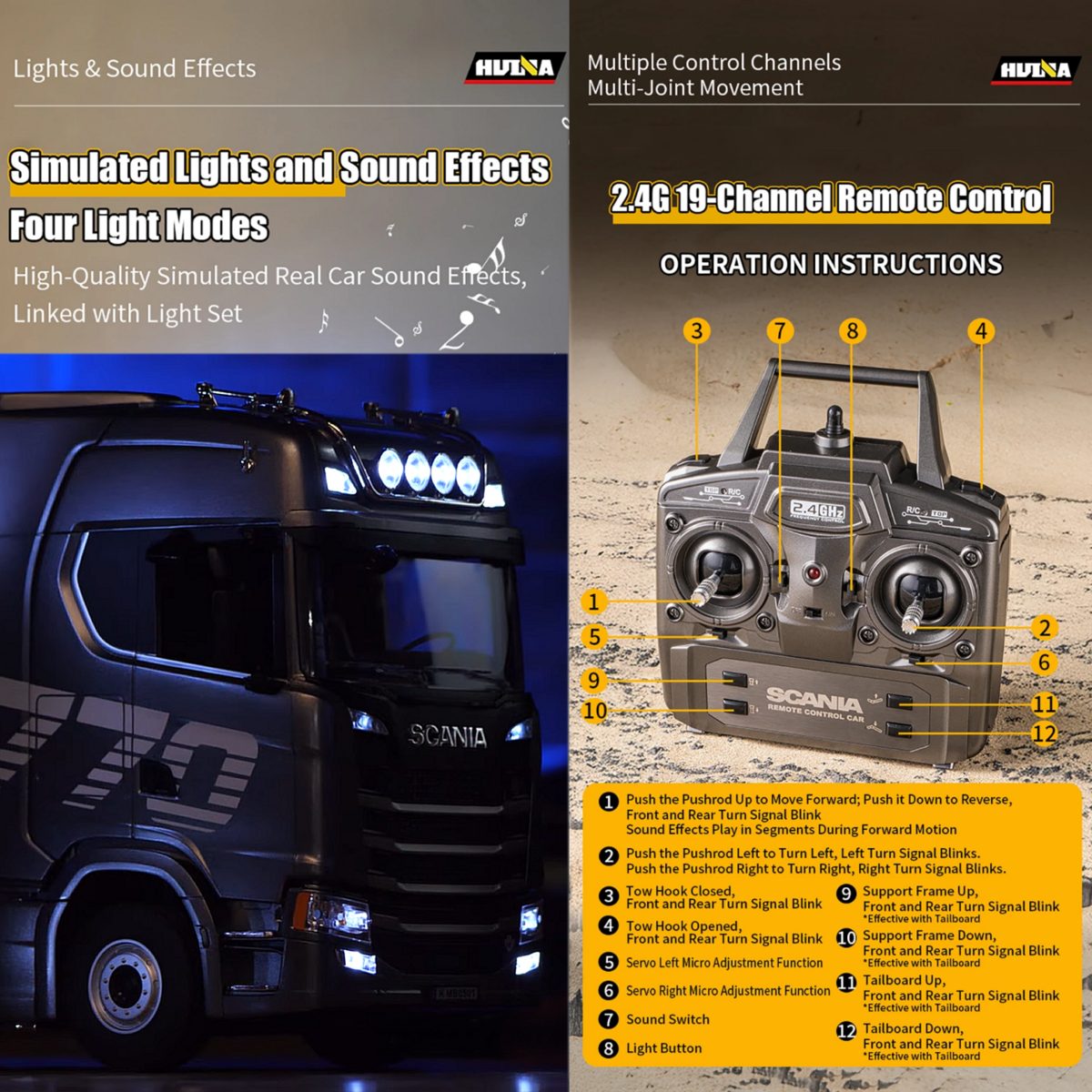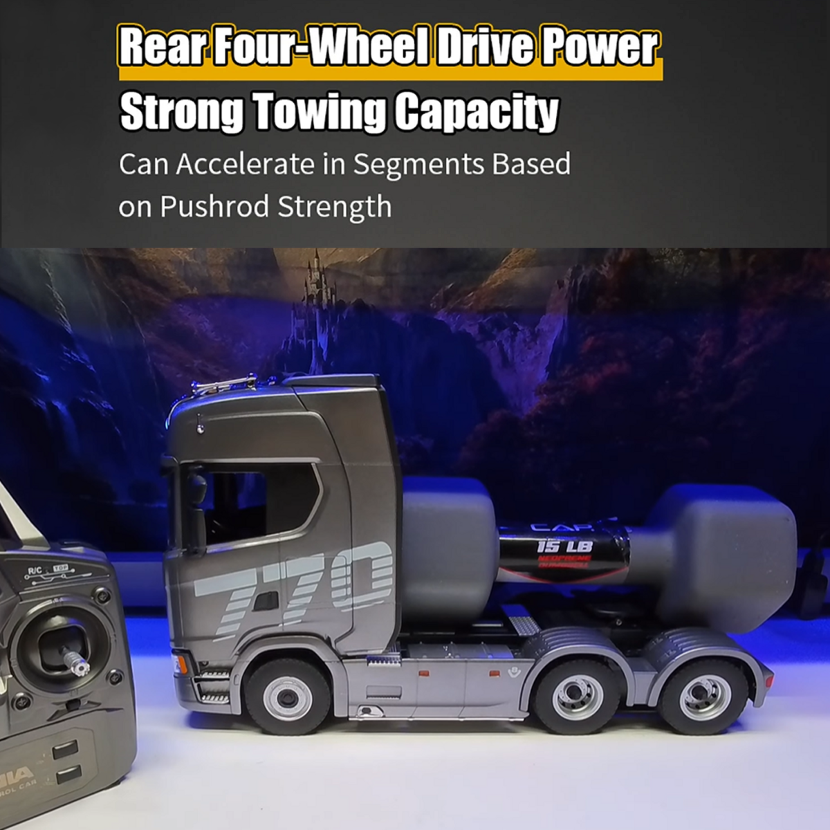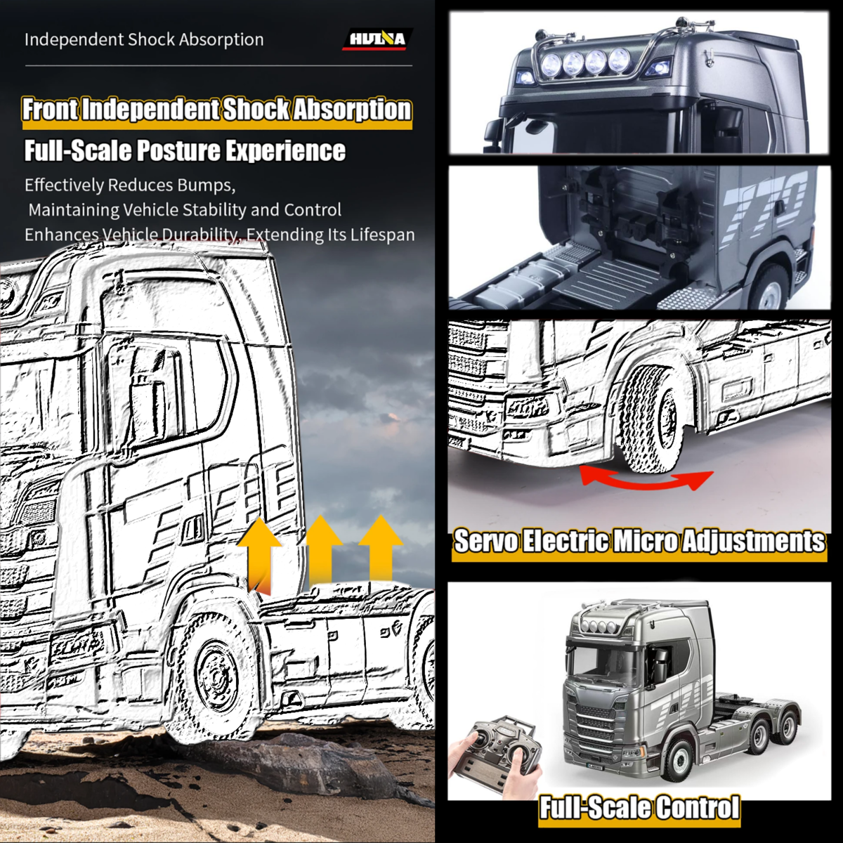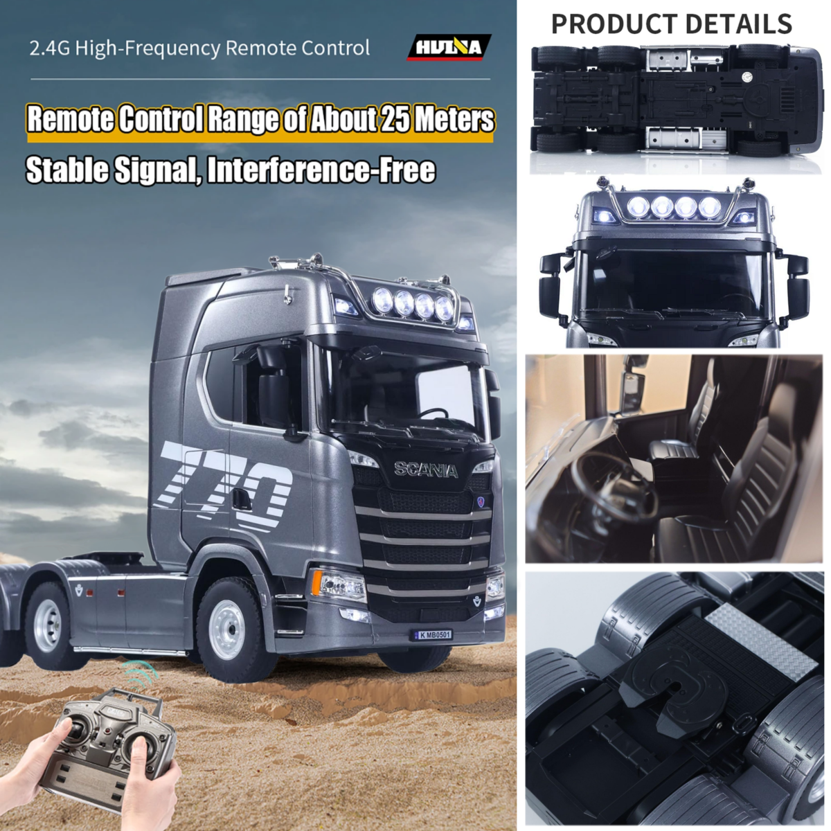 The Huina 1/18 Scania 770S RC Semi Trairler Truck RTR bring the power and precision of heavy-duty transport to your fingertips with the Officially Licensed Huina Scania Truck, a 1/18 scale radio-controlled tractor truck crafted for realism, performance, and fun.