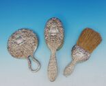 Pretty Fleury by Gorham sterling silver 3-piece dresser set. This set features repoussed flowers and scrollwork. This set includes: