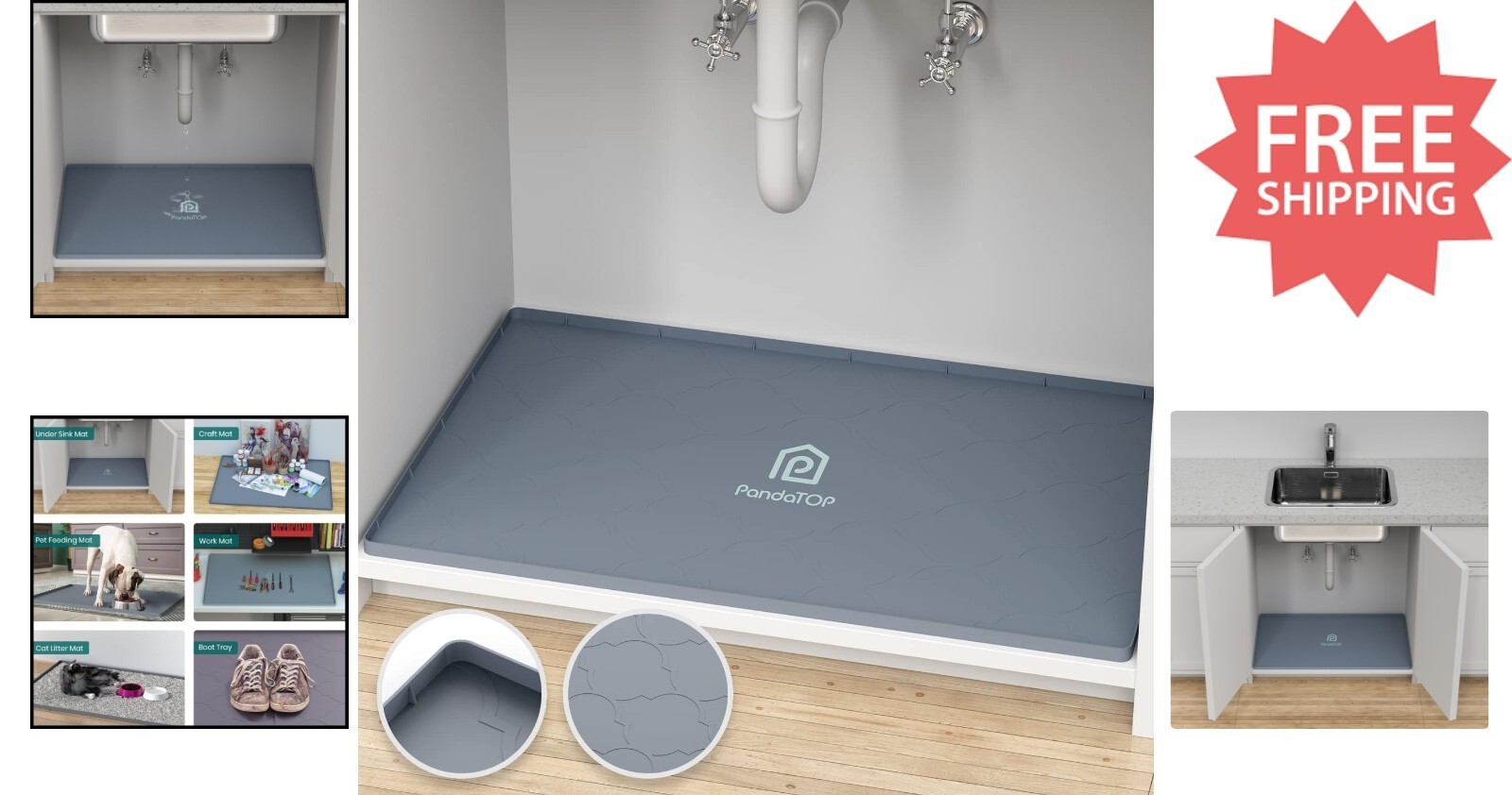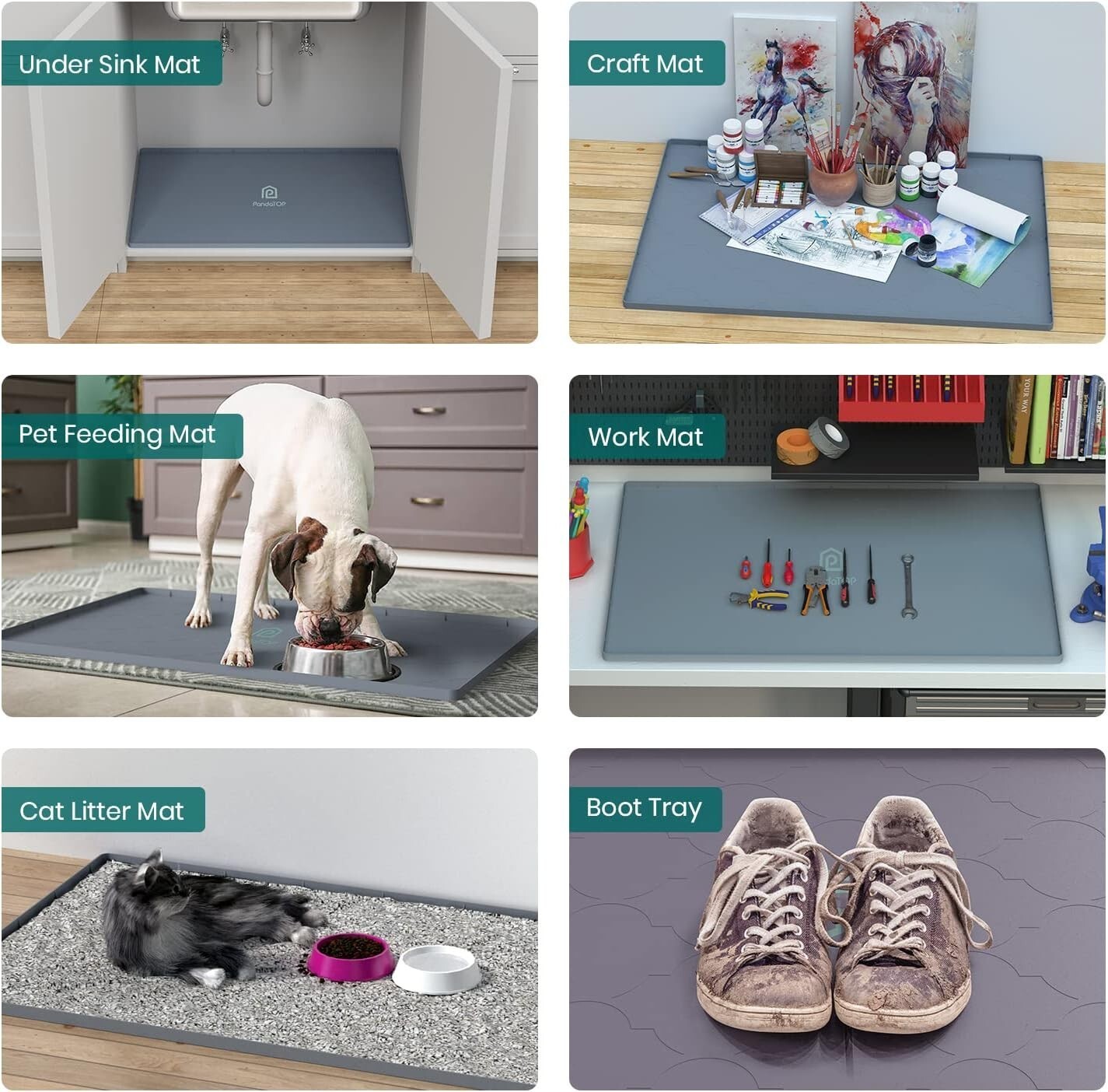 This versatile 28" x 19" silicone under sink mat is designed to fit standard kitchen and bathroom cabinets, providing comprehensive protection against leaks, spills, and damage. Its waterproof, flexible material makes it easy to clean and install around pipes and obstacles. The raised lip adds extra leak containment, while the built-in storage tray helps keep your space organized. Ideal for kitchens, bathrooms, laundry rooms, and more?use it as a pet feeding mat, boot tray, craft mat, or any activity prone to mess. Durable and easy to maintain, this multi-function mat ensures your cabinets stay dry and pristine for to come.